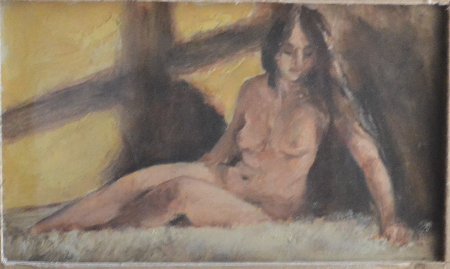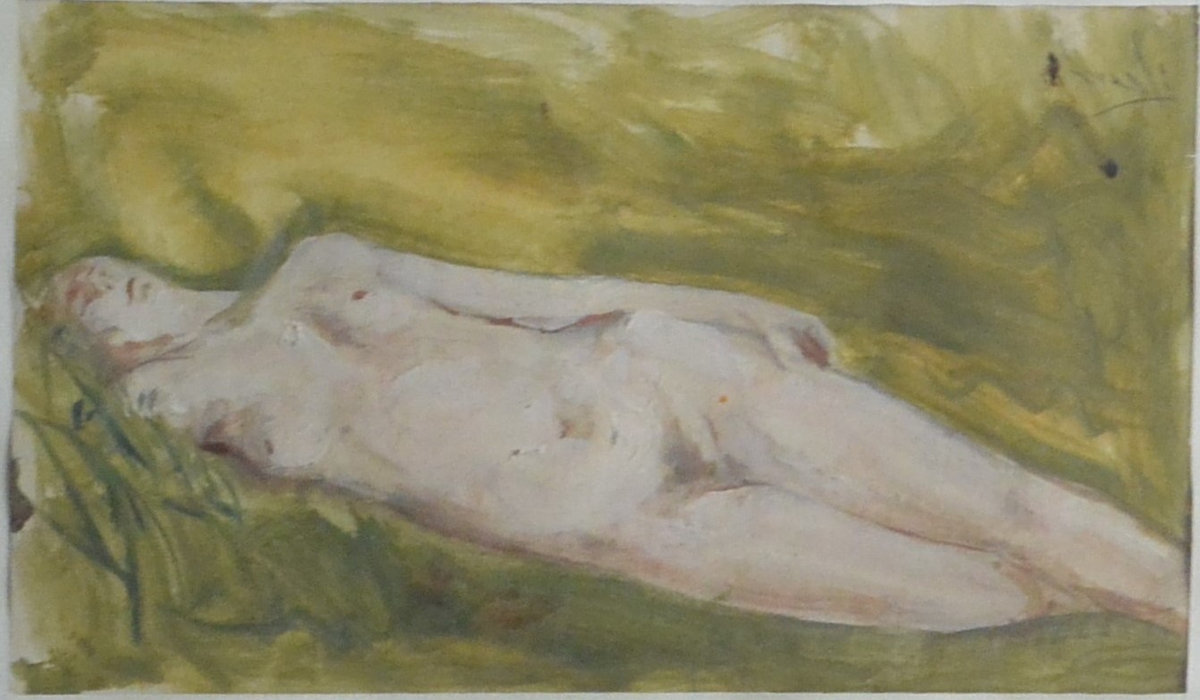 Juanvi, Juan Vicente Barrio, Mujer desnuda tumbada en el campo, pintura oleo cartulina, enmarcado, pintura 12×21 cms. y marco 35×46,50 cms.