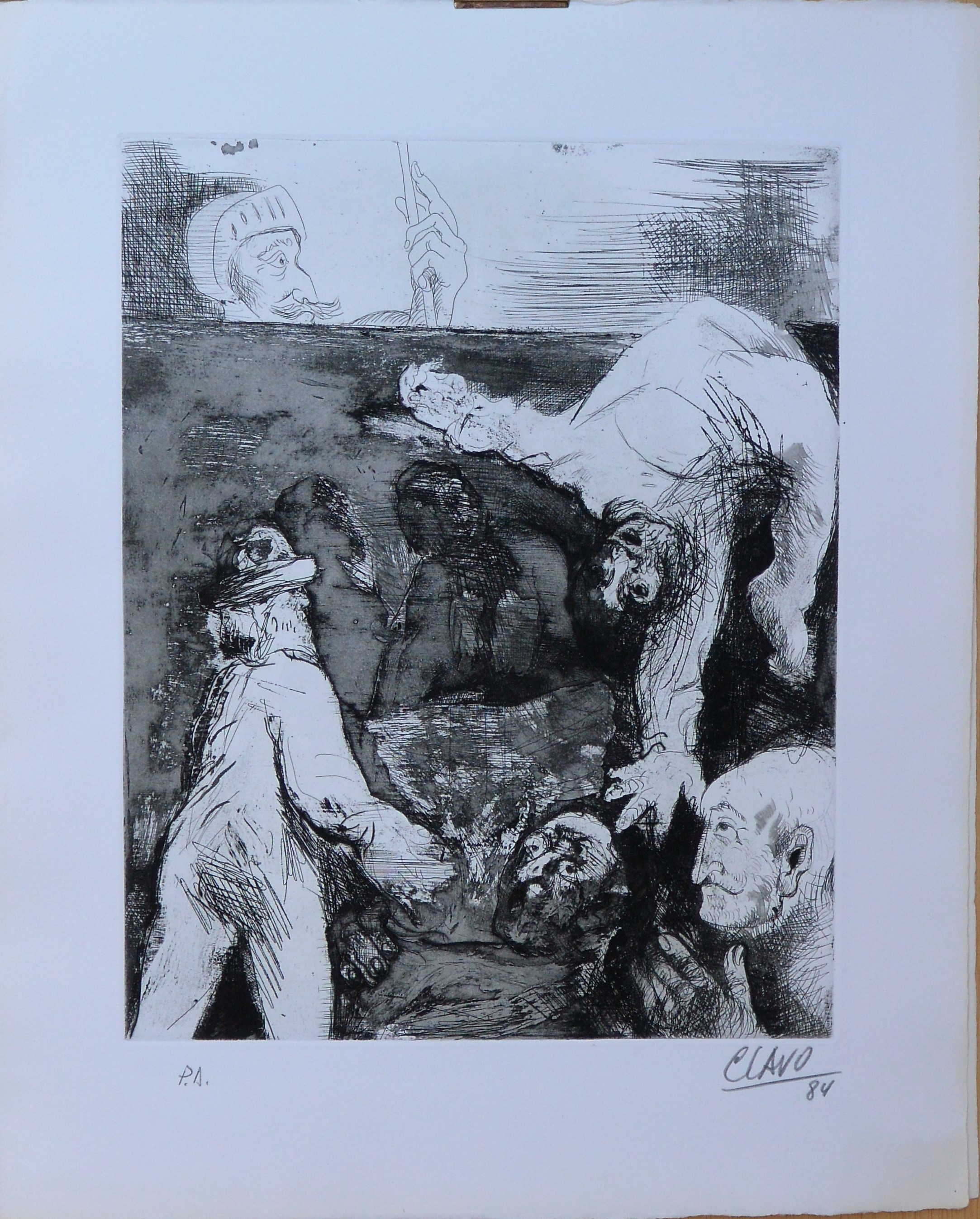 Javier Clavo, Escena de El Quijote, grabado, numerado p.a. y firmado a lápiz, huella 30×24 cms. y papel 41×33 cms