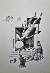 Celedonio Perellón, Mundo, El equilibrista, litografía perteneciente a la carpeta Mundo Demonio y Carne, edición 266 ejemplares, numerado y firmado a lápiz, 49,50×34,50 cms.