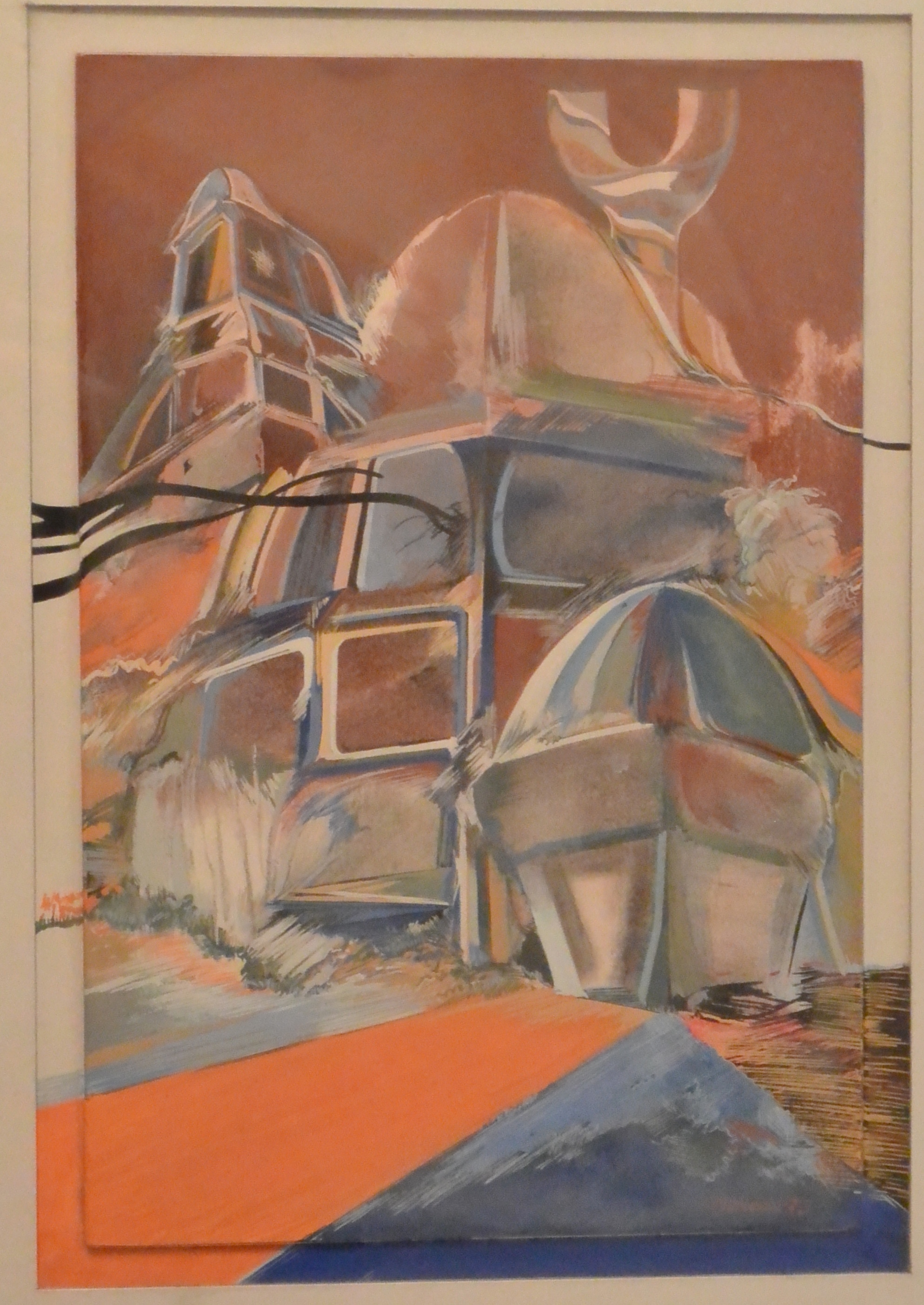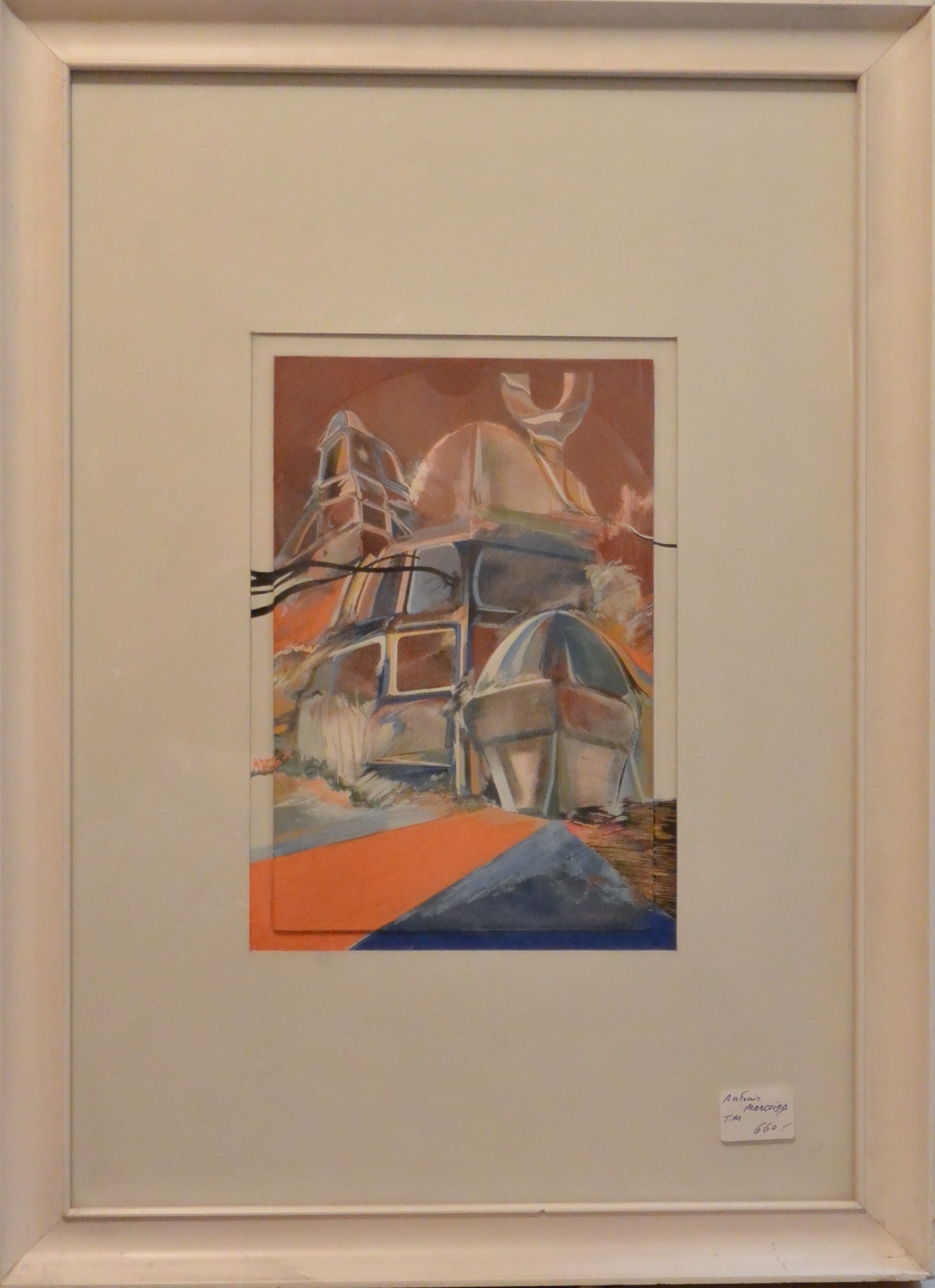 Antonio Marcoida, paisaje con arquitectura, técnica mixta tabla, enmarcado, pintura 26×18 cms. y marco 54×40 cms. Marco incluido