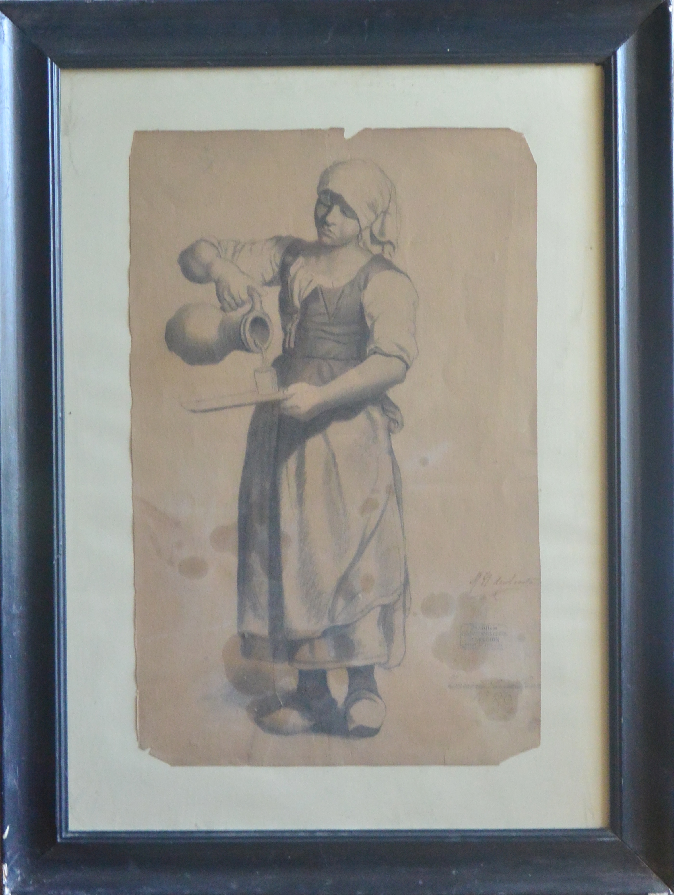 Academia, Lechera, Dibujo principios siglo XX con sello escuela de artes y oficios, firmado Zacarías Cruz, enmarcado, dibujo 57×36 cms. y marco 80×60 cms. Marco incluido