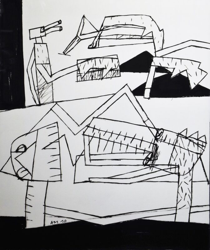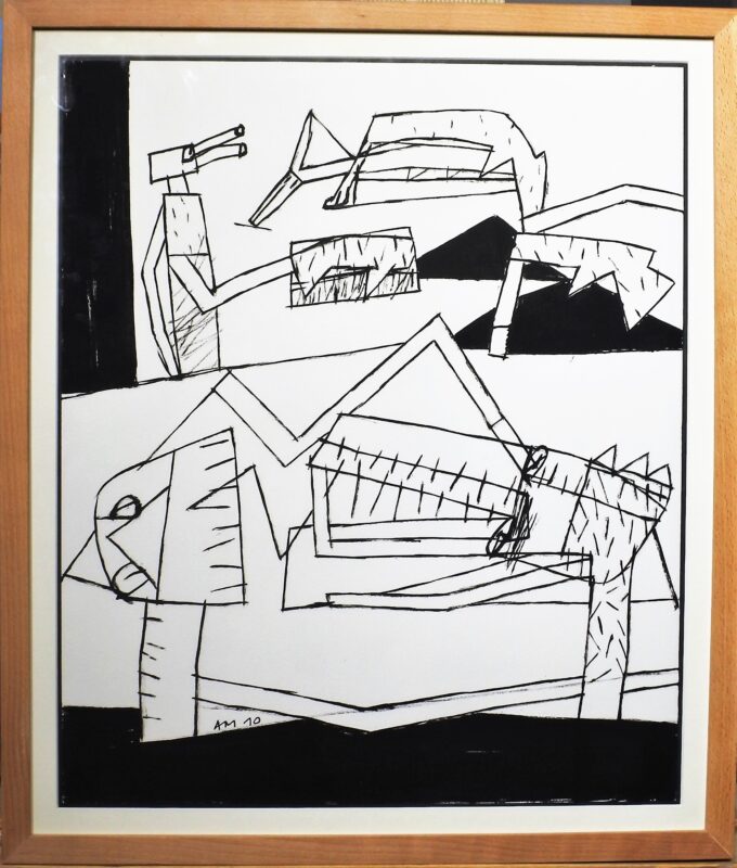 Adrian Moya, Encuentros, dibujo tinta china papel, enmarcado, obra 61×52 cms. y marco 64×55 cms.