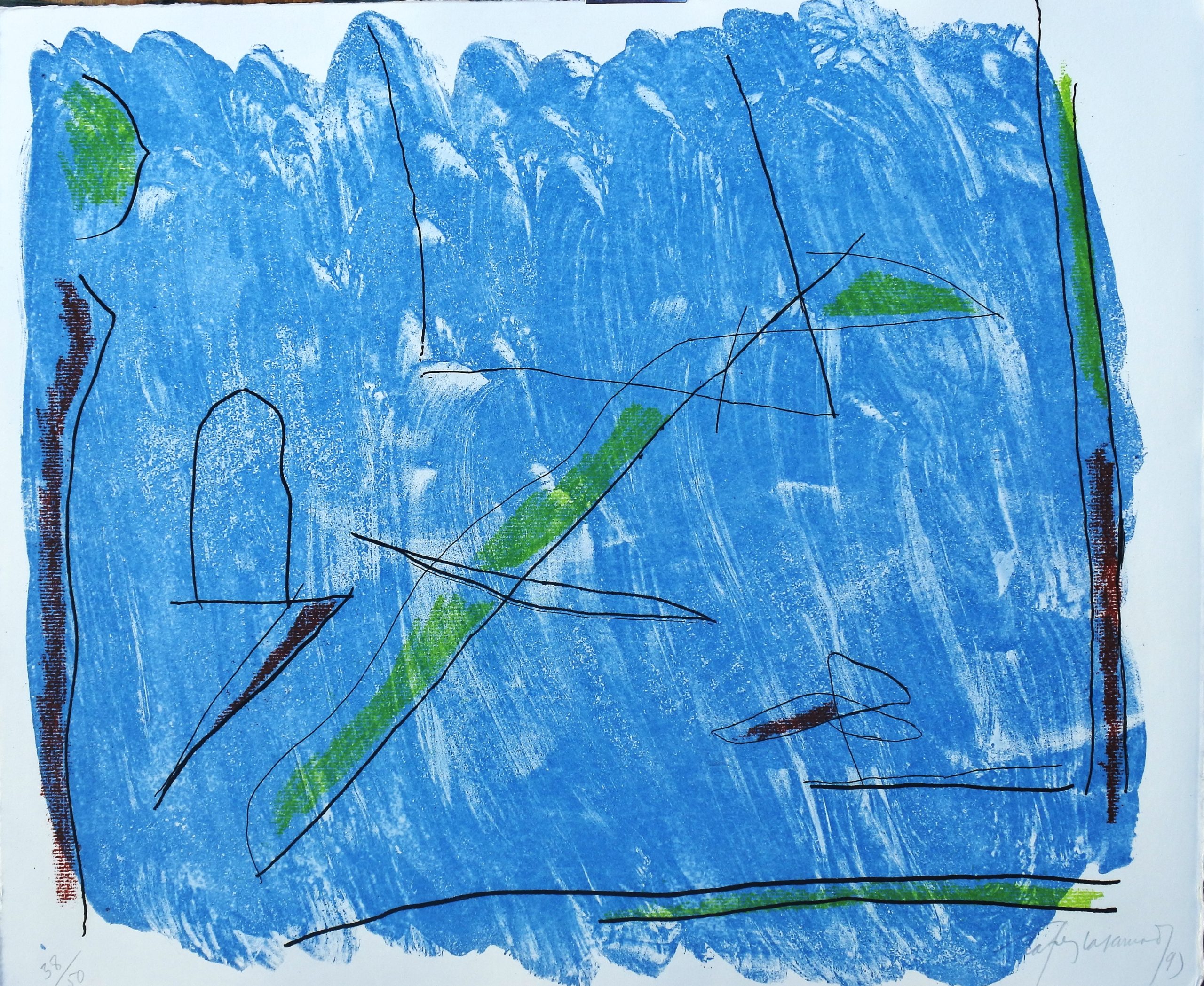 Albert Rafols Casamada, Composición sobre azules, grabado aguafuerte, edición 50 ejemplares, numerado y firmado a lápiz, 38×46 cms.