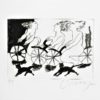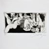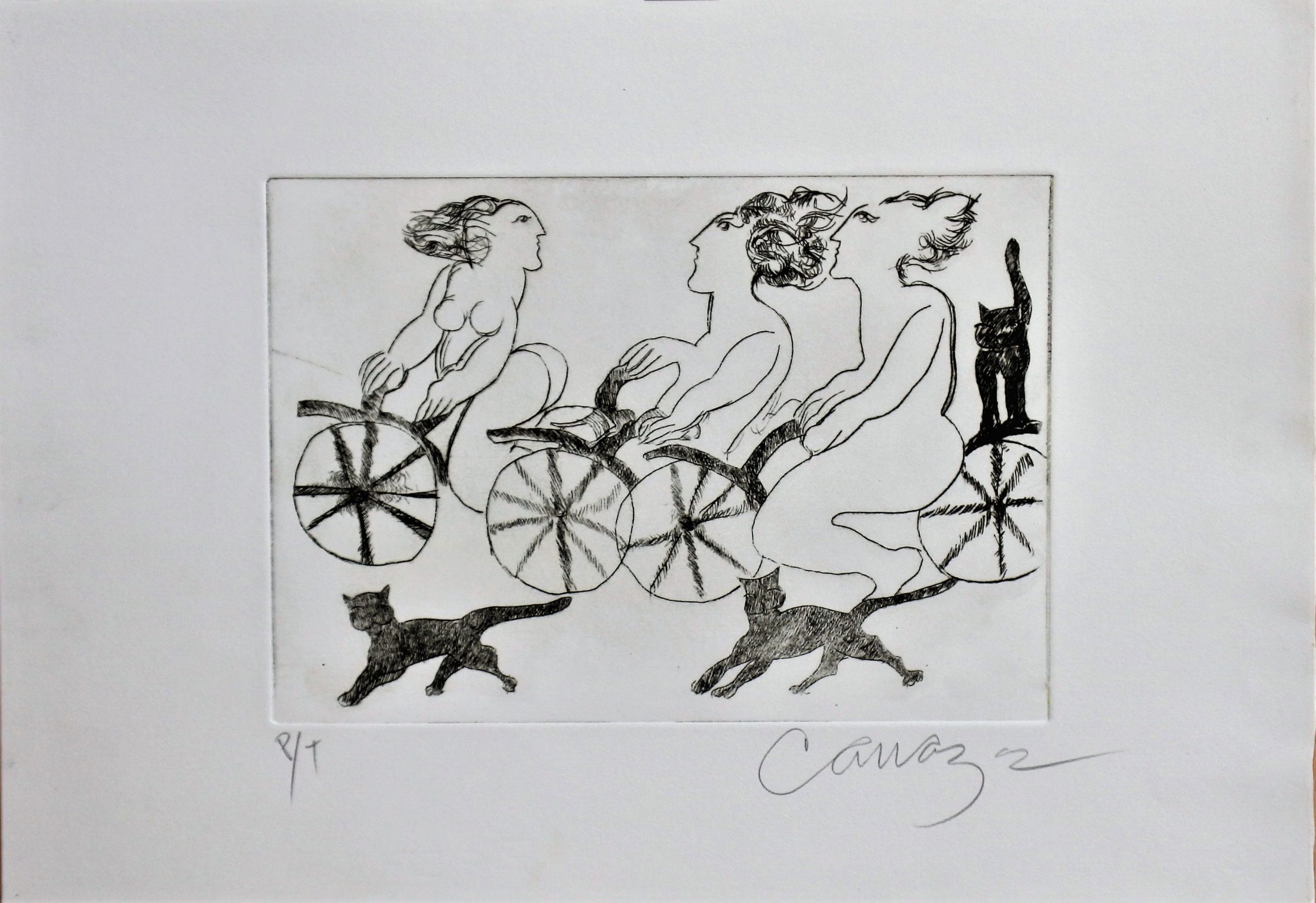 Alberto Cavazos, Las tres gracias en bicicleta fondo blanco, grabado aguafuerte, edición 60 ejemplares, numerado P.T. y firmado a lápiz, plancha 21×29 cms. y papel 35×50 cms.