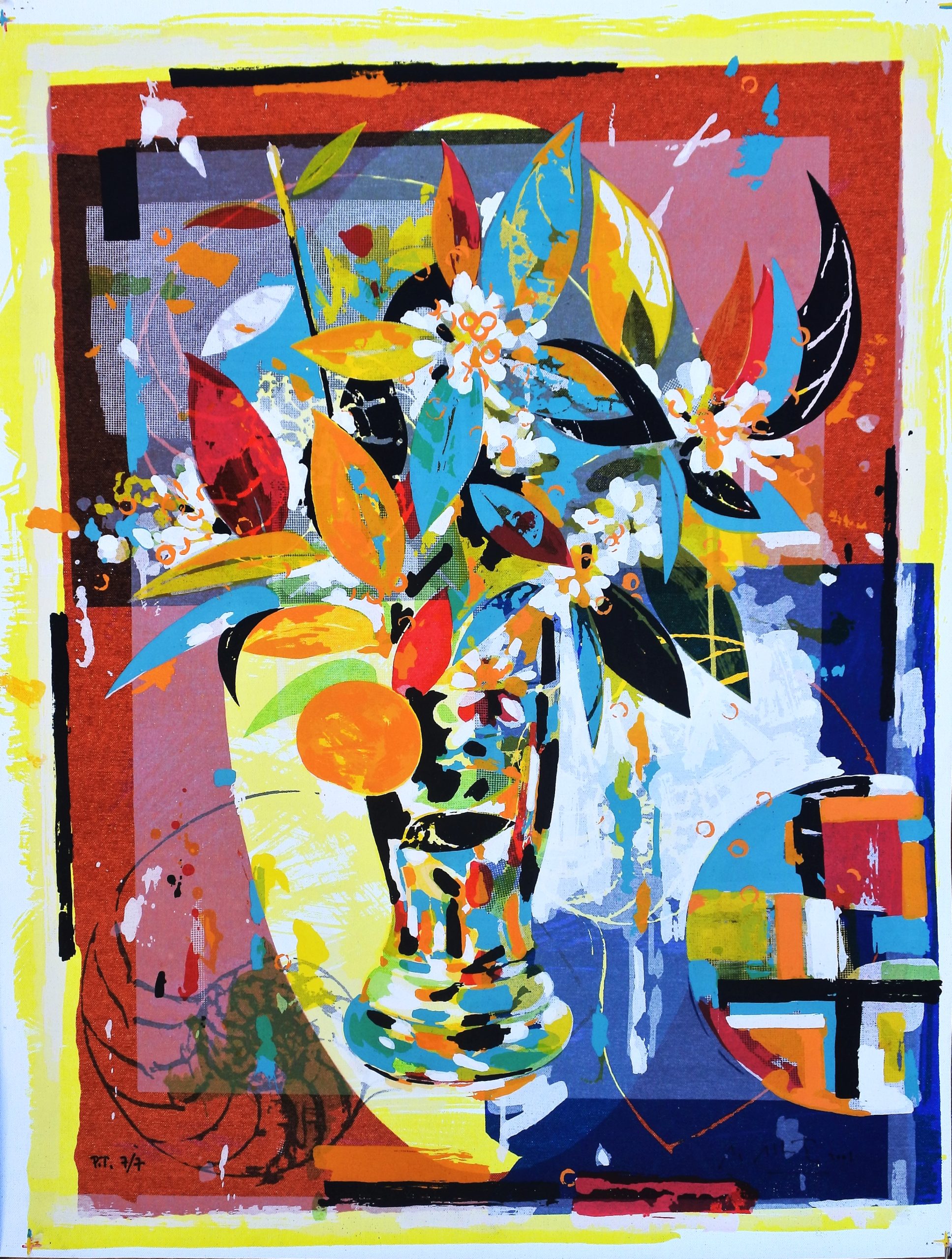 Alfonso Albacete, Jarra con flores II, serigrafia sobre lienzo, numerado p.t y firmado con tinta, 77×58 cms.
