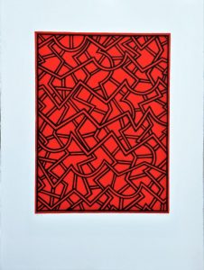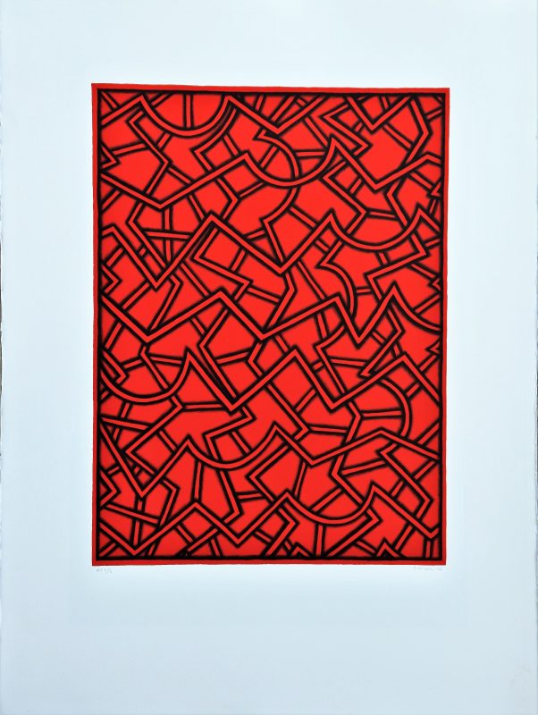 Alfredo Alcaín, Ondulaciones y lineas sobre rojo, litografía, edición 50 ejemplares, datado 03 numerado p.t. y firmado a lápiz, plancha 51×38 cms. y papel 76×57 cms.