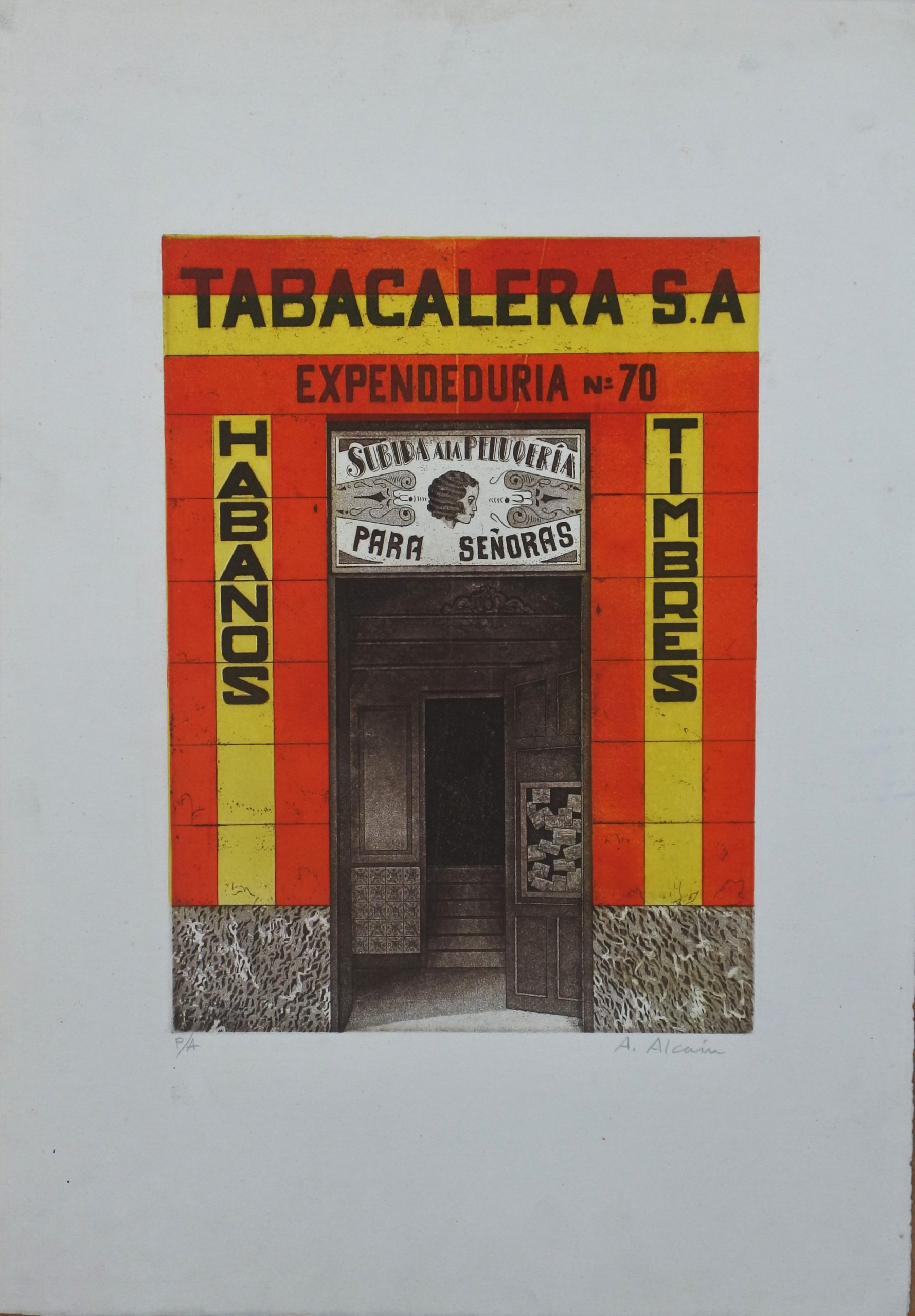 Alfredo Alcain, Tabacalera S.A., grabado aguafuerte, numerado p.a. y firmado a lápiz, plancha 33×24,50 cms. y papel 55×39 cms.