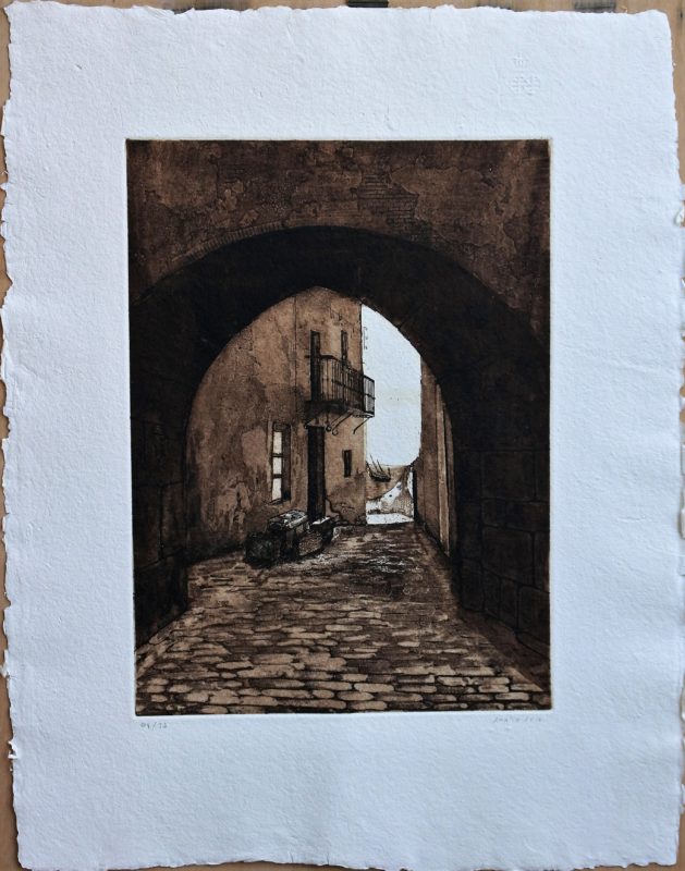 Amalia Avia, Callejón con arco, grabado aguafuerte, edición 92 ejemplares, numerado y firmado a lápiz, plancha 43×31 cms. y papel 63×50 cms.