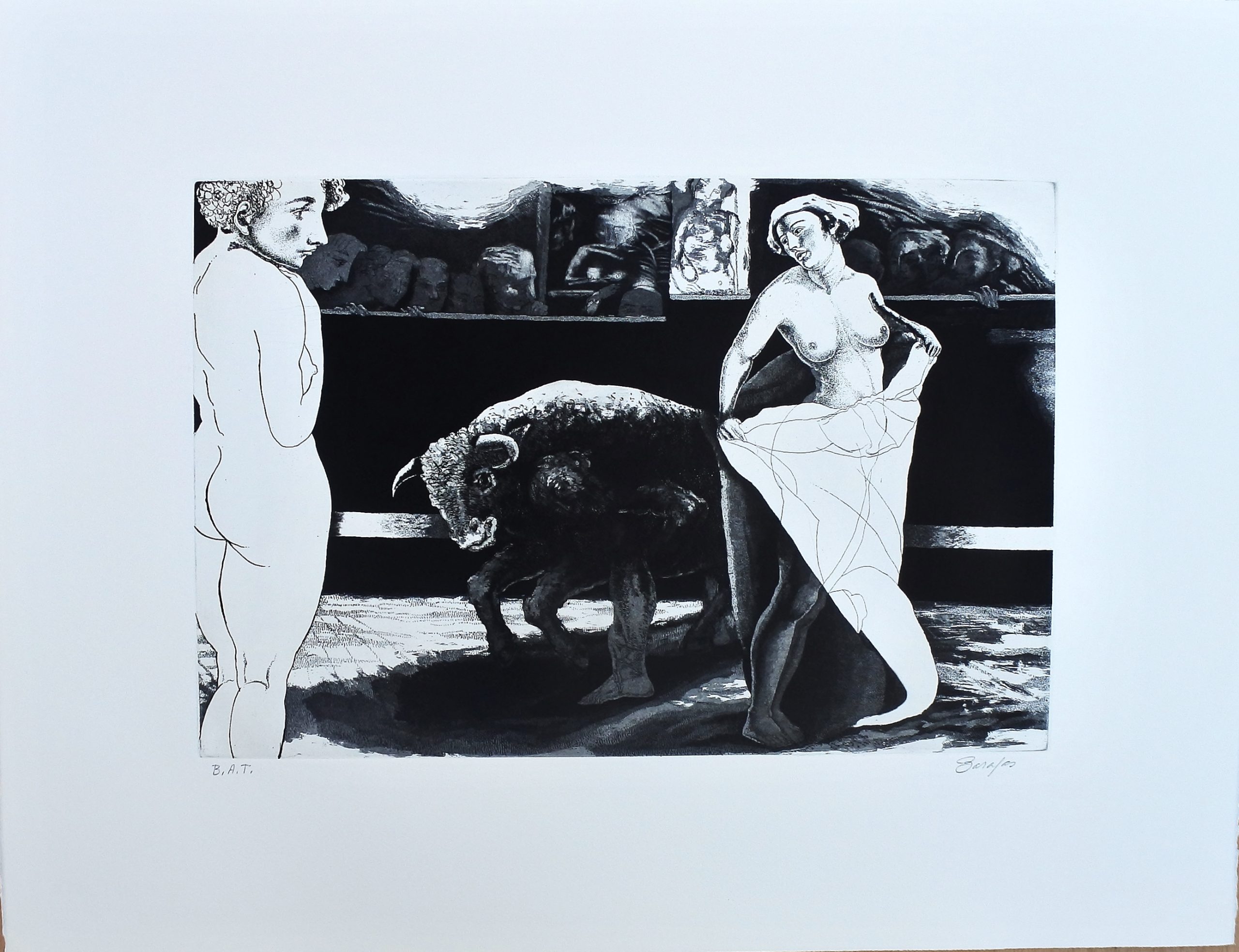 Andrés Barajas, Tauromaquia Mujer y Toro II, Grabado aguafuerte, numerado p.e. y firmado a lápiz, plancha 30×45 cms. y papel 50×63 cms.