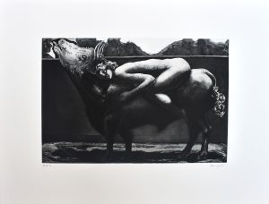 Andrés Barajas, Tauromaquia Mujer y Toro V, Grabado aguafuerte, numerado p.e. y firmado a lápiz, plancha 30×45 cms. y papel 50×63 cms.