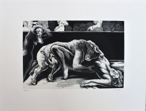 Andrés Barajas, Tauromaquia Mujer y Toro VI, Grabado aguafuerte, numerado p.e. y firmado a lápiz, plancha 30×45 cms. y papel 50×63 cms.