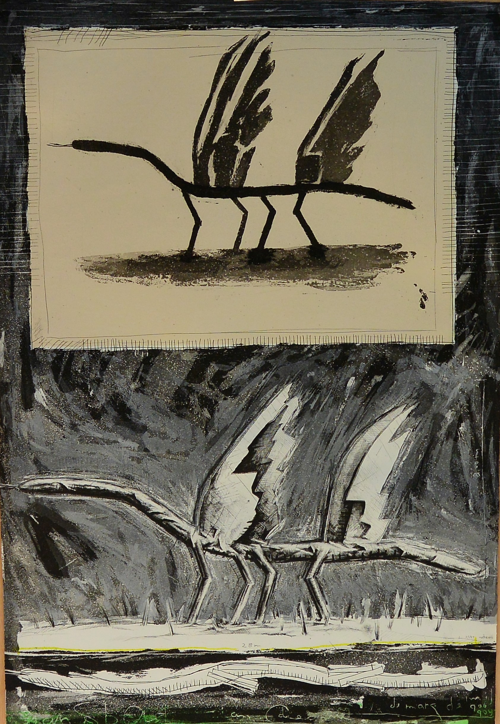 Andrés Nagel 1991, Aves esculturales, aguafuerte y collage, edición 75 ejemplares, numerado y firmado a lápiz, 98×69 cms.