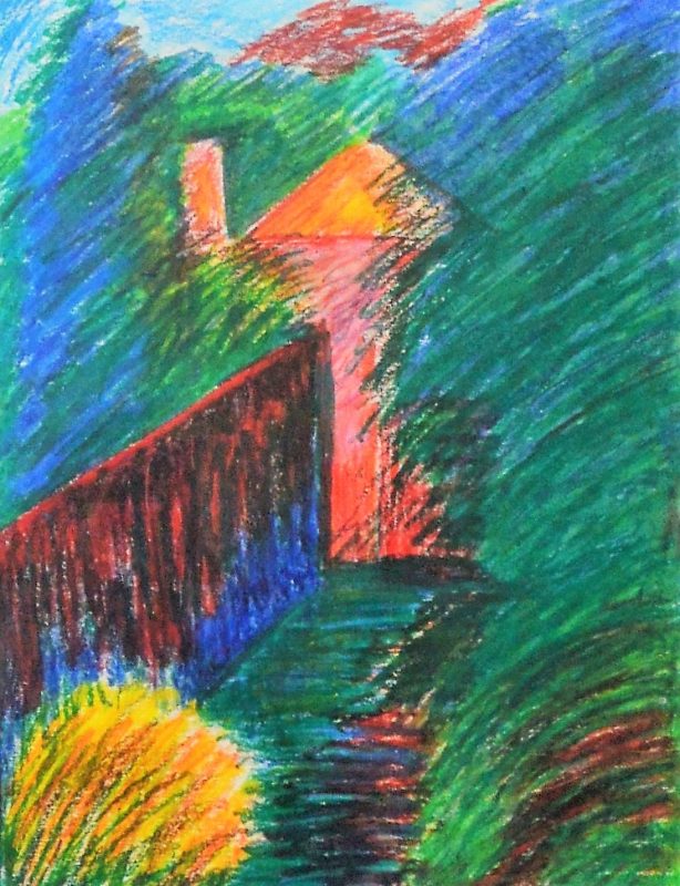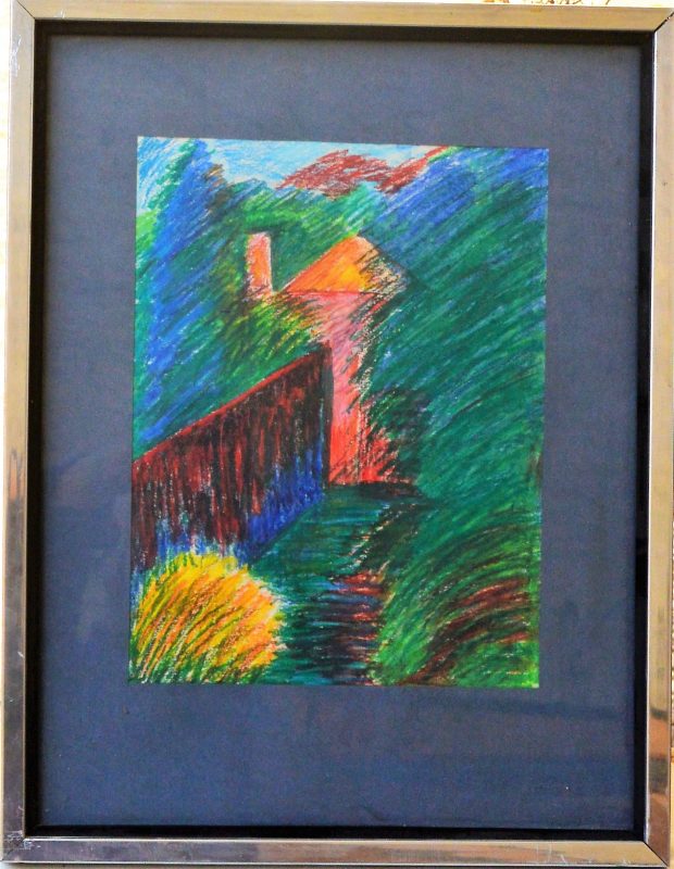 Anónimo, Casa en el bosque, dibujo ceras papel, enmarcado, dibujo 31×23 cms. y marco 48×37 cms.