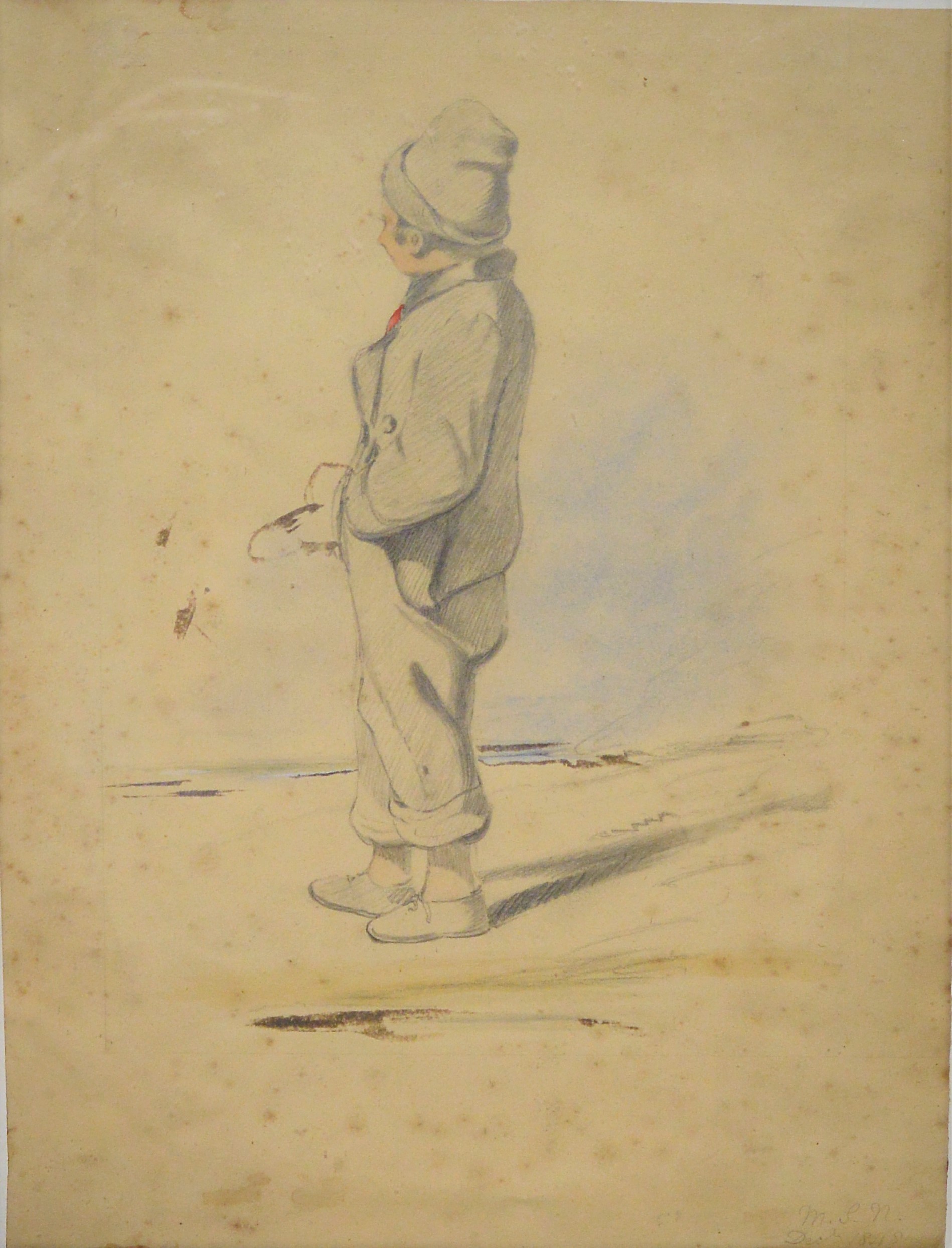 Anónimo francés, Personaje junto al mar, dibujo lápiz siglo XIX, enmarcado, dibujo 24×18,50 cms. y marco 46,5×36,5 cms.