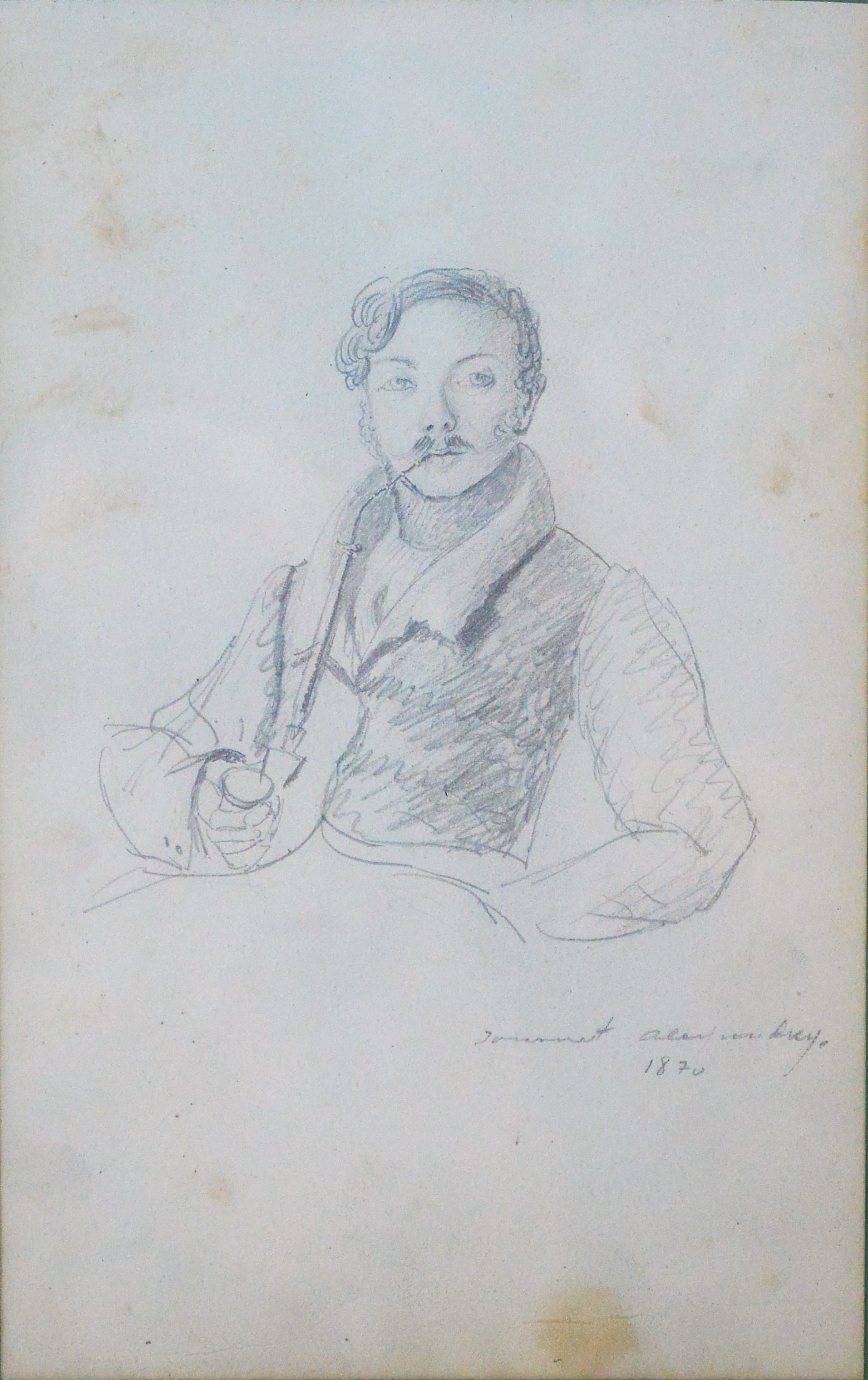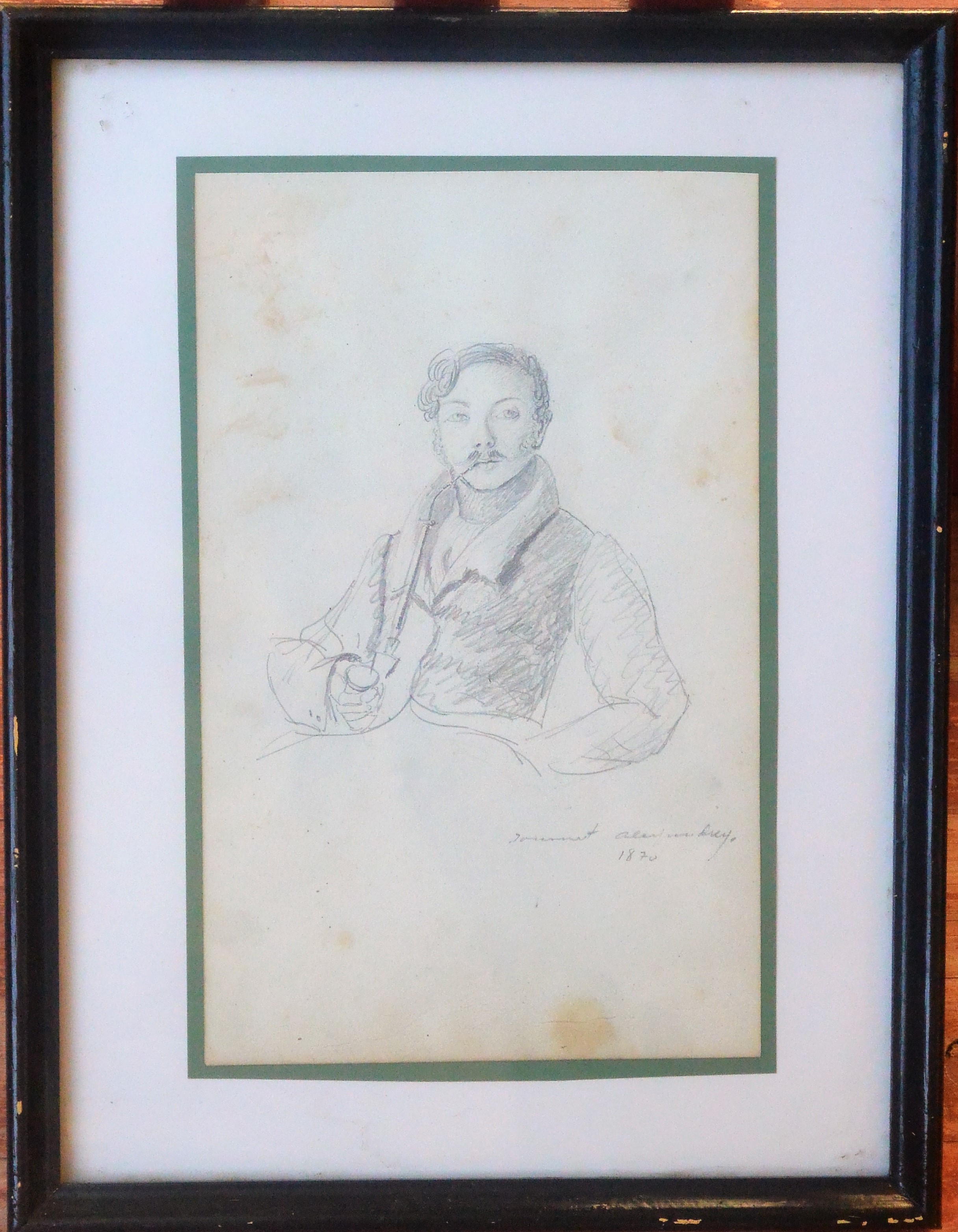 Anónimo francés, Retrato de caballero fumando pipa, dibujo lápiz papel fechado 1870, enmarcado, dibujo 21×13 cms. y marco 29×22,50 cms.