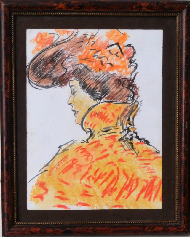 Anónimo, Mujer de perfil, escuela catalana, dibujo ceras papel, enmarcado, dibujo 19×14 cms. y marco 25×20 cms.