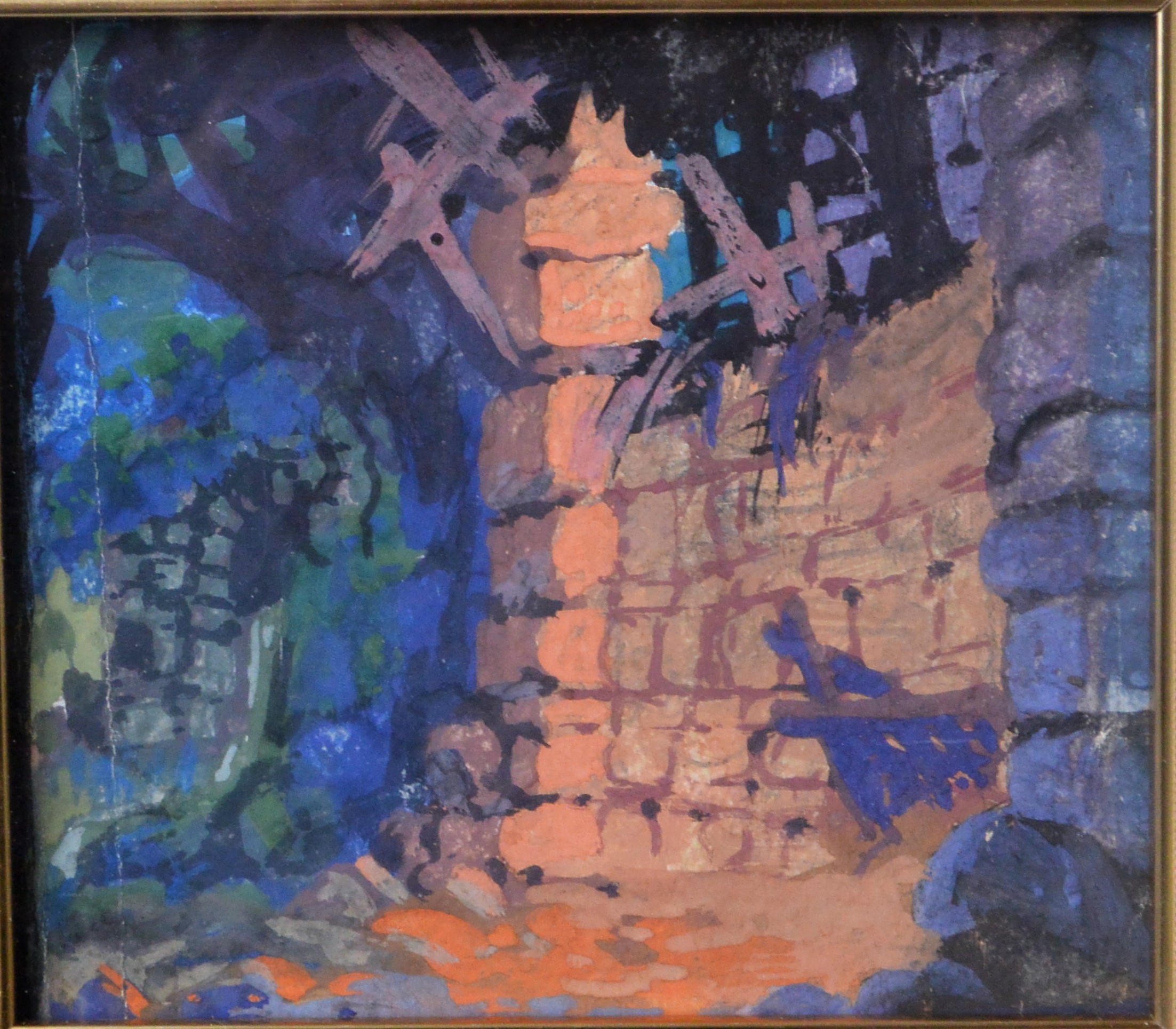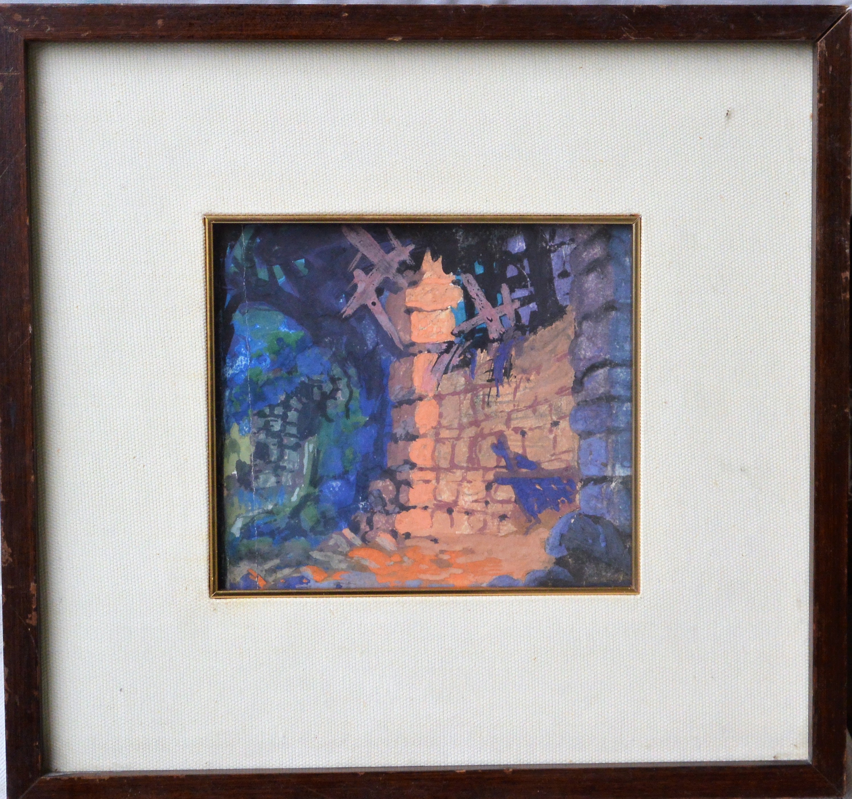 Anónimo, Ruinas, pintura gouasche cartulina, enmarcado, obra 15×17 cms. y marco 32×34 cms.