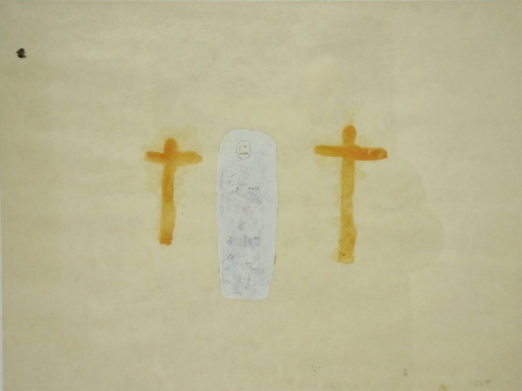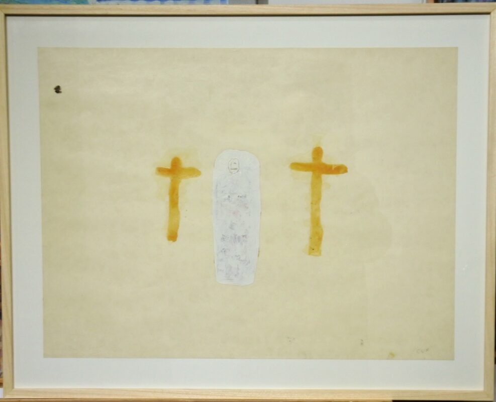 Antón Lamazares, Entre dos cruces, original técnica mixta cartulina, enmarcado, pintura 45×61 cms. y marco 57,50×72,50 cms.