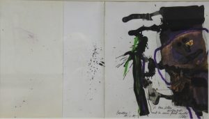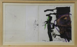 Antoni Clavé, Personatge, pintura original acrílico sobre tapas de catálogo, dedicado, datado 1985 y firmado con tinta, enmarcado, pintura 30×53 cms y marco 38×61 cms.