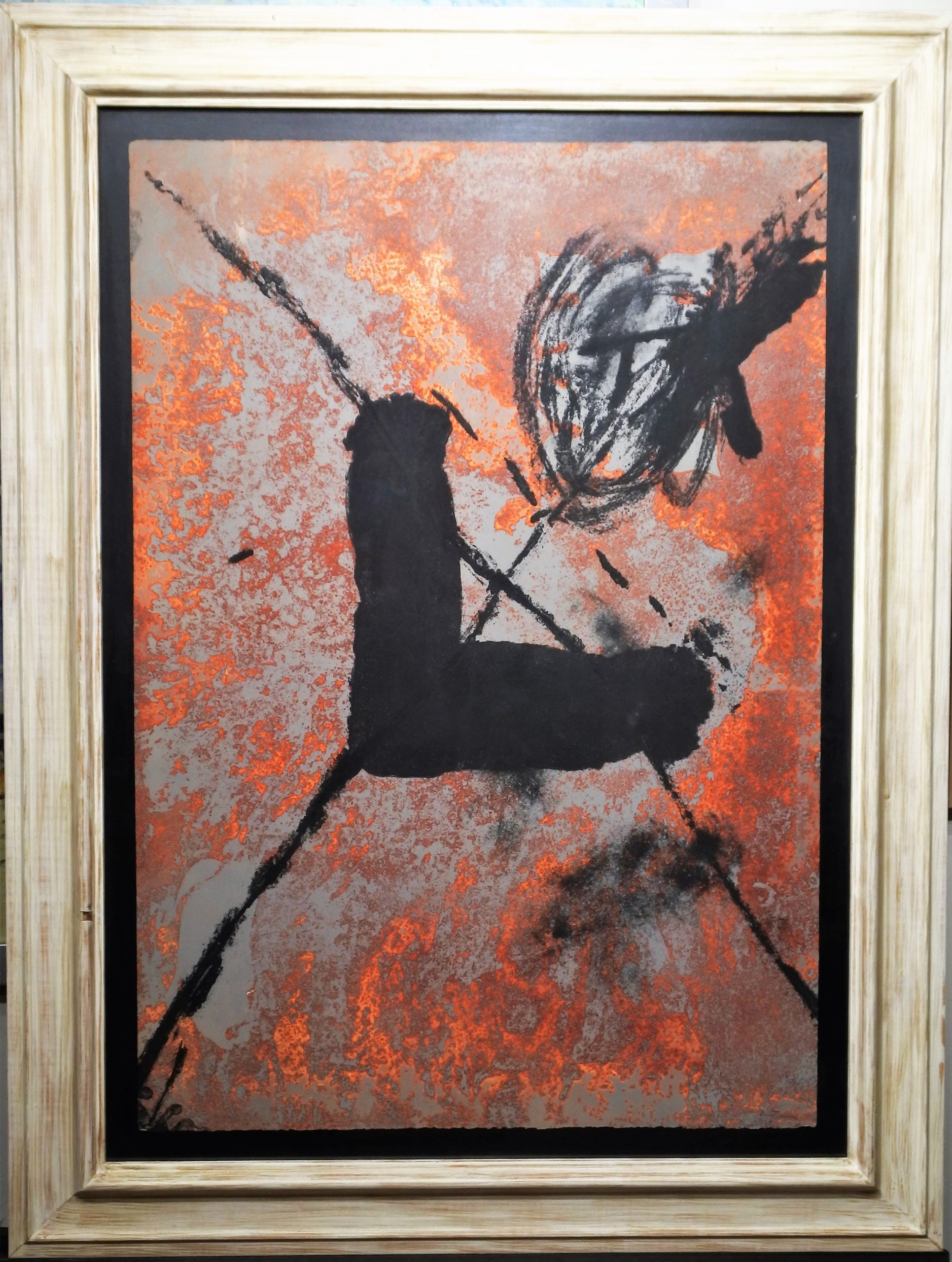 Antoni Tapies, L sur rouille, Aguafuerte y materia plástica en varias tintas sobre fondo entintado a rodillo, edición 50 ejemplares. numerado y firmado a lápiz, enmarcado, grabado 90×63 cms. y marco 115×87 cms.
