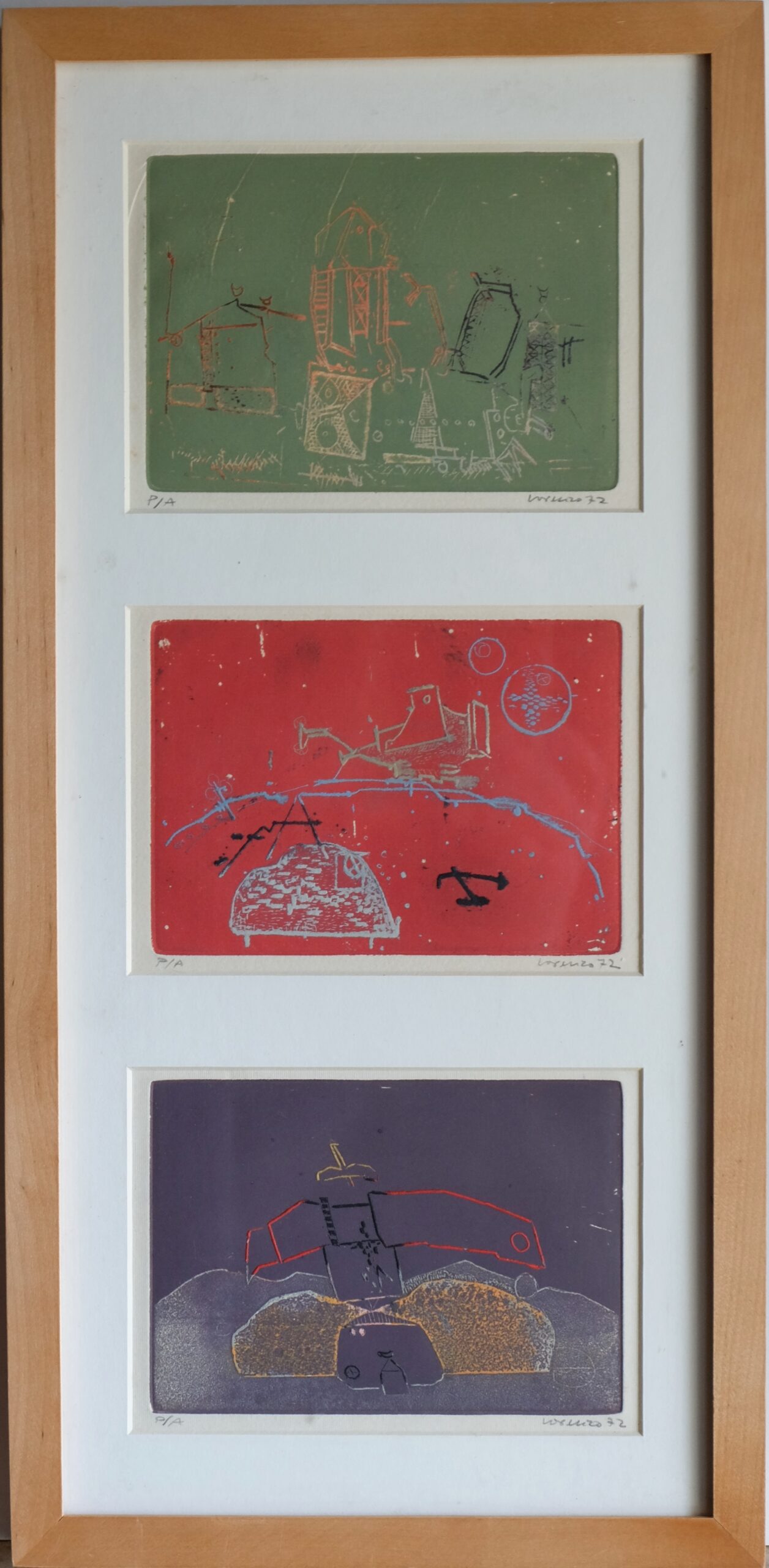 Antonio Lorenzo, 3 serigrafías III, 13×18 cms. cada una en un mismo marco. Numeradas y firmadas a lapiz. Medidas marco 52×25,50 cms.