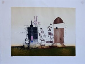 Antonio Lorenzo, Estación espacial, grabado, edición 75 ejemplares, numerado, datado 75 y firmado a lápiz, plancha 37×48,50 cms. y papel 50×65,50 cms.