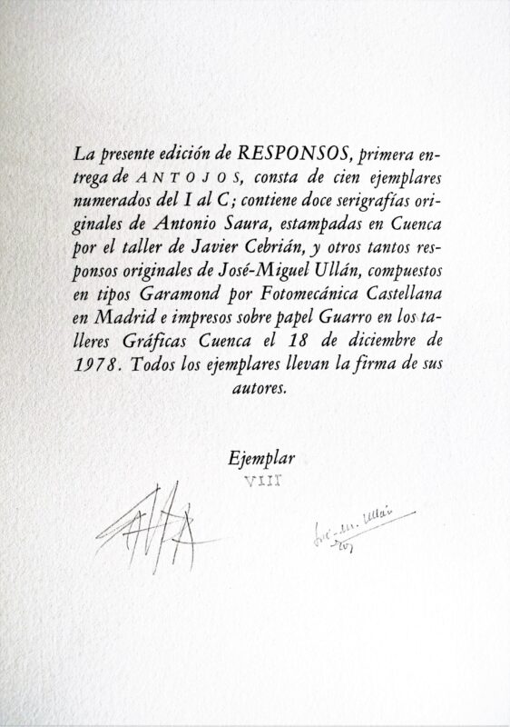 Antonio Saura 1978, Responsos XI, serigrafia, edición de 100 ejemplares, numerado y firmado en la justificación de la carpeta, 32×23 cms. Se acompaña con un responso de José-Miguel Ullán