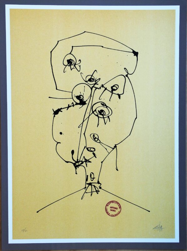 Antonio Saura 1981, Cuatro máscaras para cuatro autorretratos II, litografía, edición 80 ejemplares, numerado y firmado a lápiz, 65×48 cms. Se acompaña con un poema de Luceberg firmado