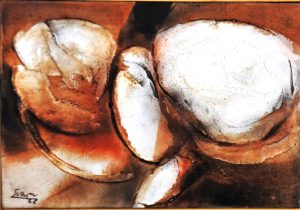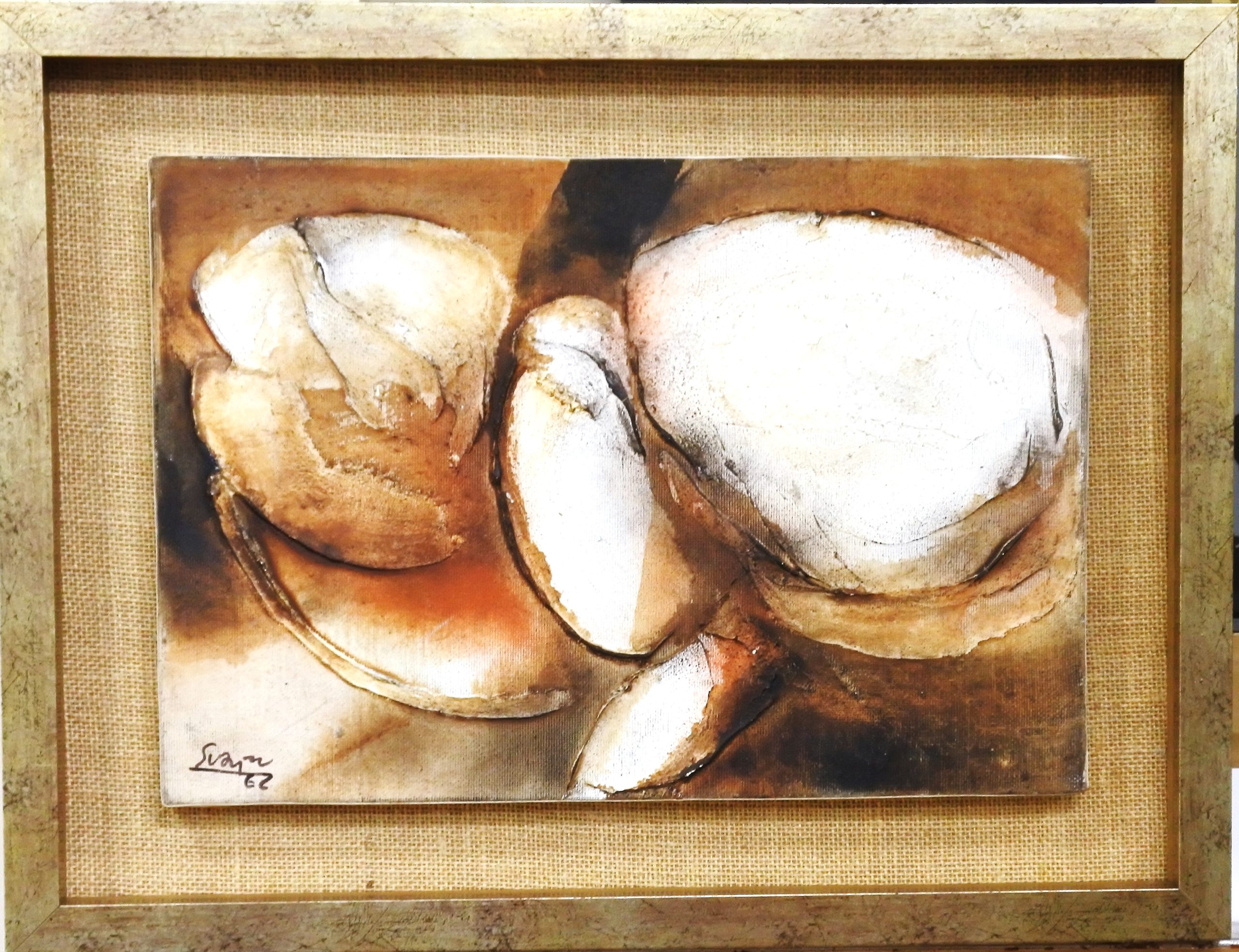 Antonio Suarez 62, Bodegón sombrío, pintura oleo sobre lienzo, enmarcado, pintura 24×35 cms. y marco 35×46 cms.
