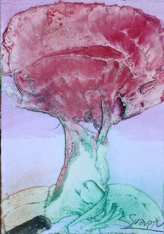 Antonio Suarez, Arbol de copa rosa, pintura original técnica mixta cartulina, 19×13 cms.
