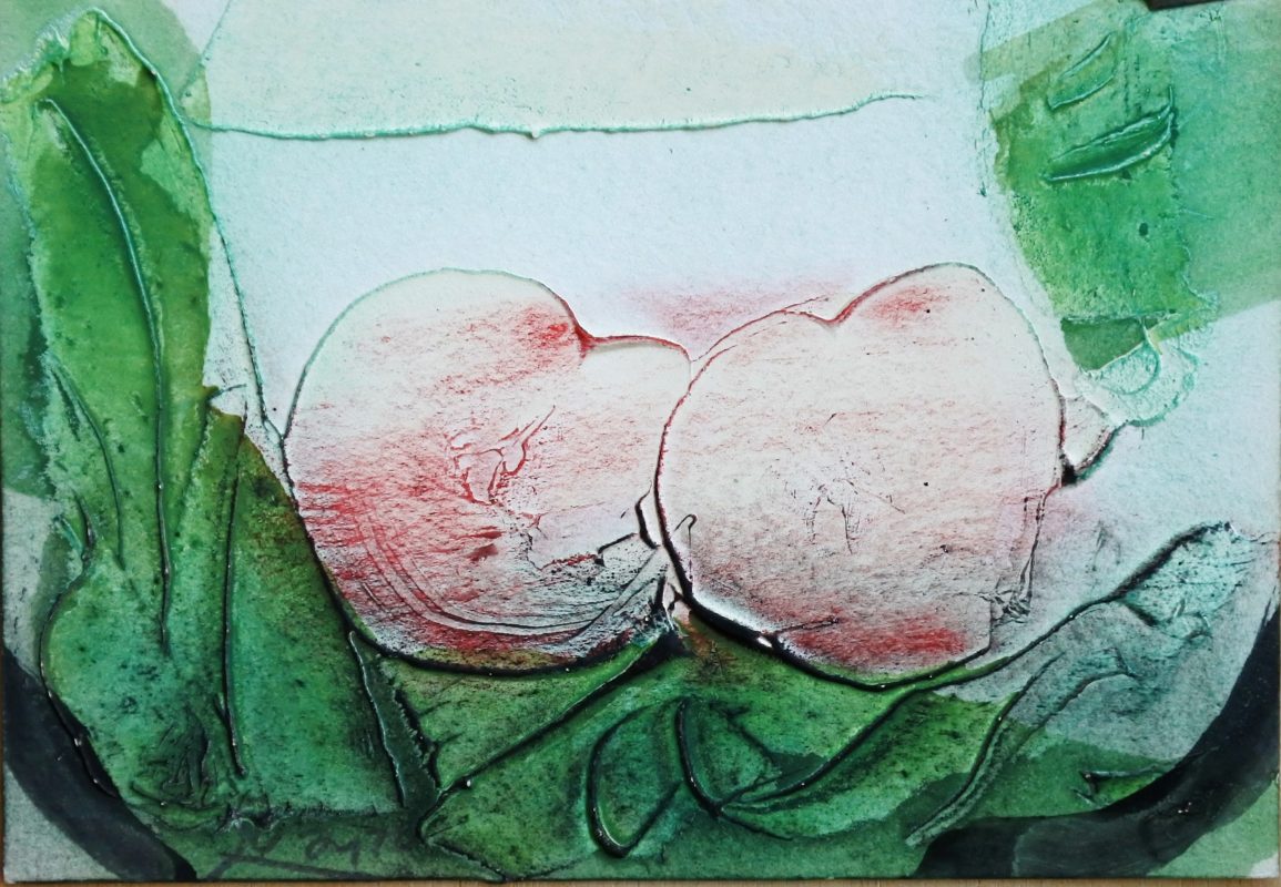 Antonio Suarez, Bodegón con fruta, pintura original técnica mixta cartulina, 10,50×15,50 cms.