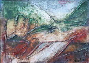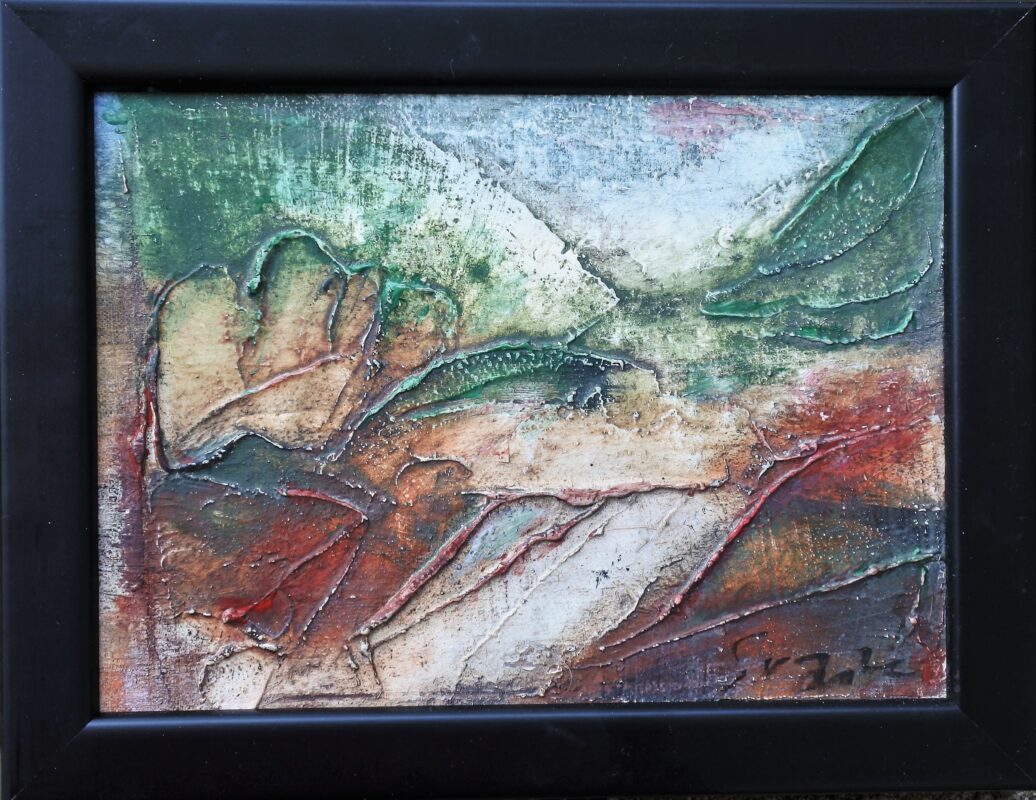 Antonio Suarez, Cañada, pintura técnica mixta lienzo, enmarcado, pintura 17×24 cms. y marco 22×28 cms.