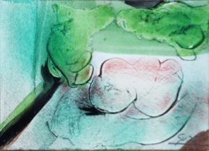 Antonio Suarez, En el jardín, pintura original técnica mixta cartulina, 11×15,50 cms.