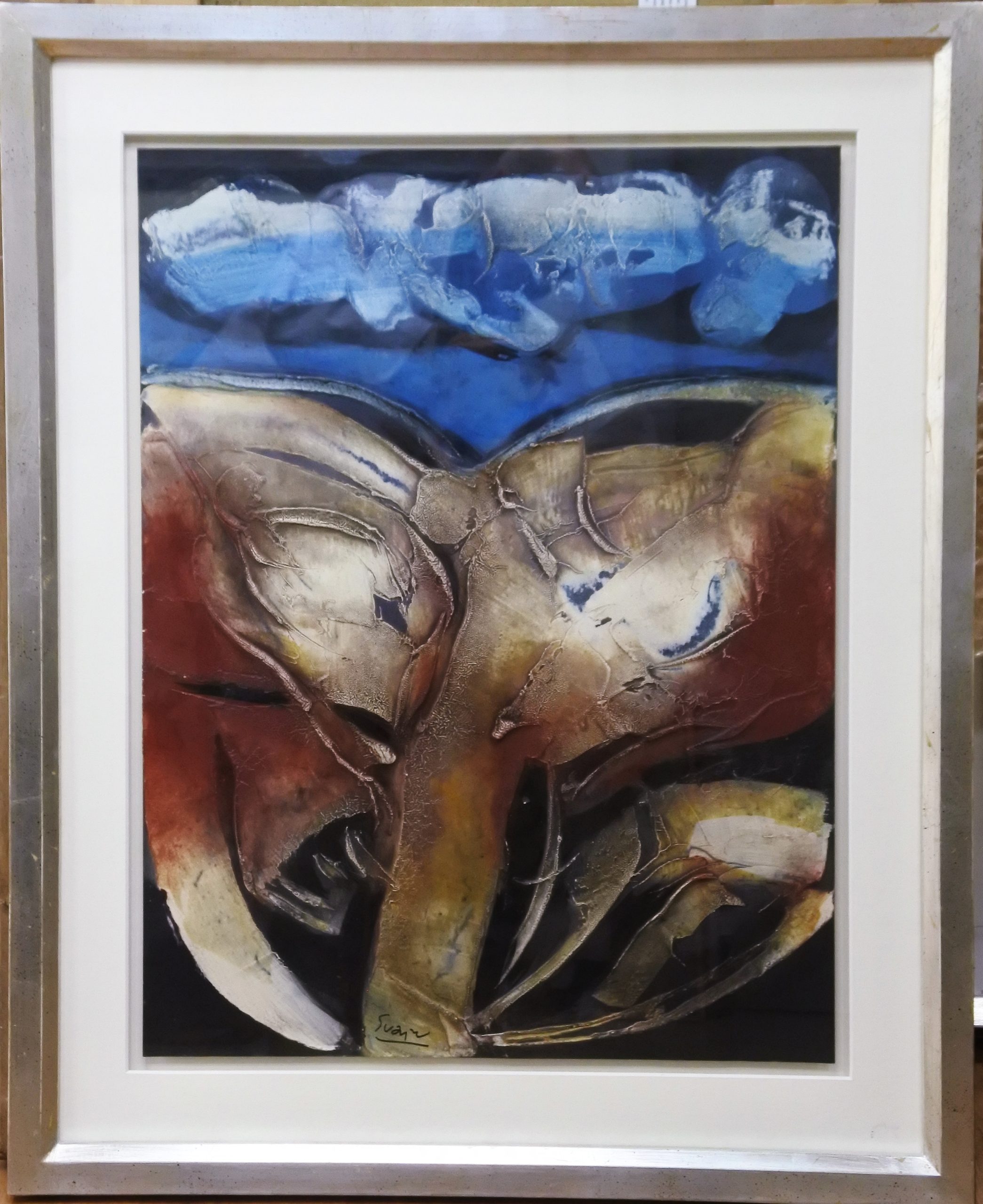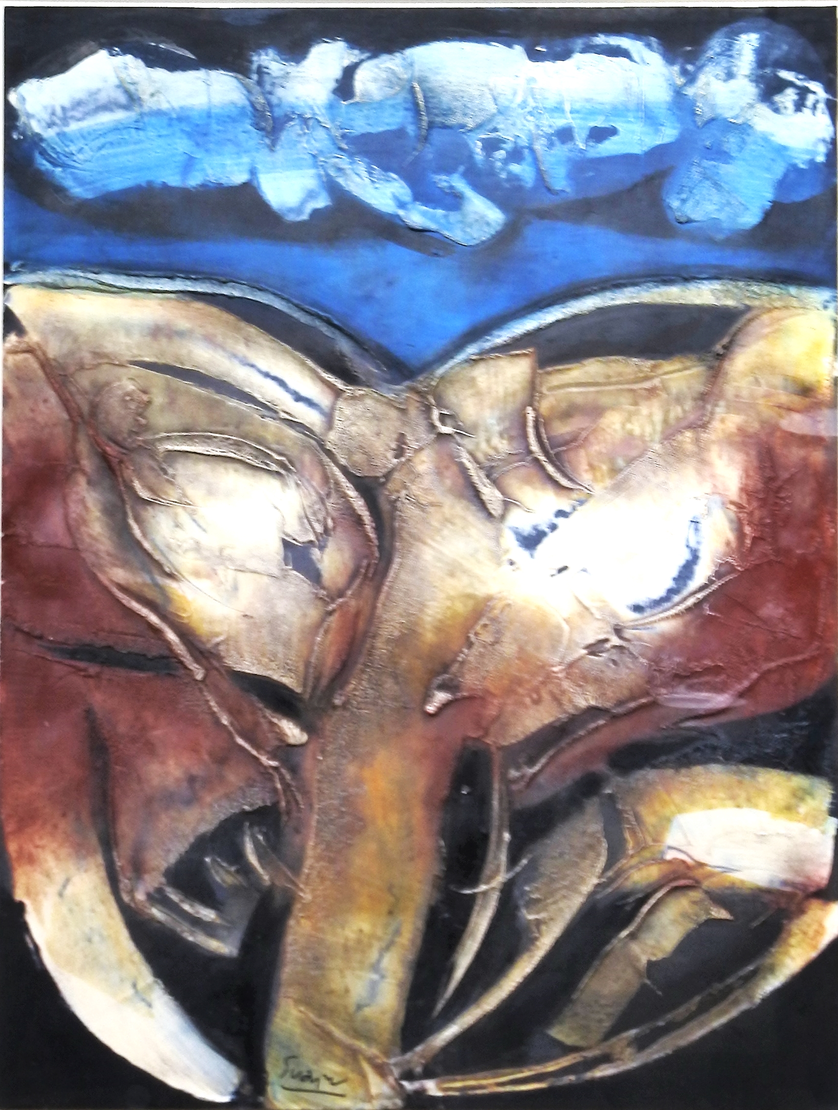 Antonio Suarez, Plantas cretácicas, pintura oleo y materia sobre lienzo, con marco artesanal, pintura 65×50 cms. y marco 84×69 cms.