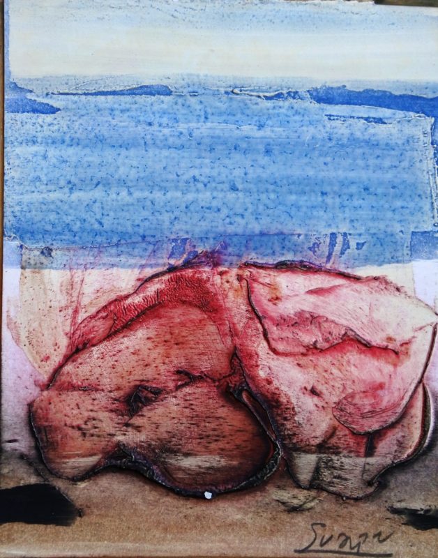 Antonio Suarez, Roca roja frente al lago, pintura original técnica mixta cartulina, 15,50×12,50 cms.