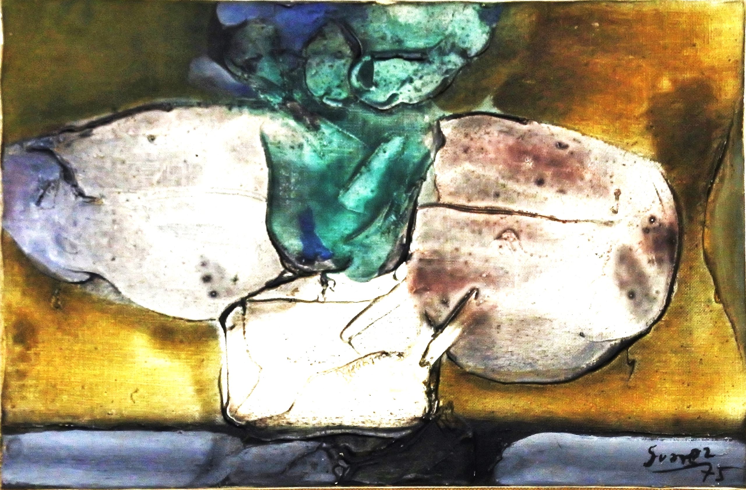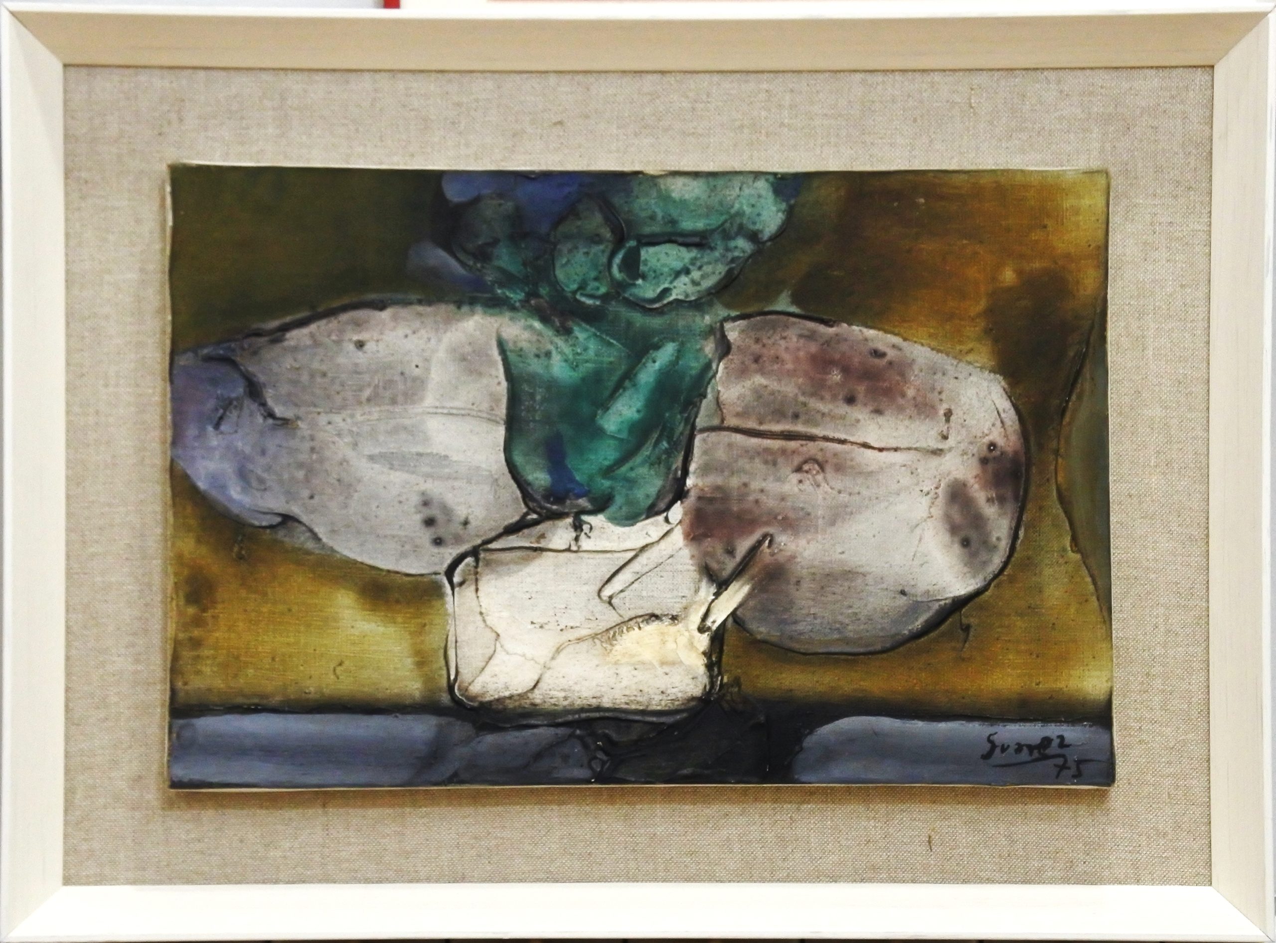 Antonio Suarez, Rocas esculturales, pintura oleo y materia sobre lienzo, enmarcado, pintura 27×41,50 cms. y marco 40×55 cms.