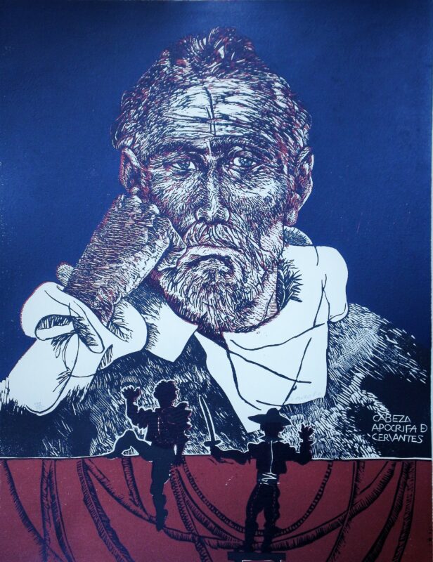 Antonio Zarco, Cabeza apócrifa de Cervantes, linograbado original, edición 195 ejemplares, numerado y firmado a lápiz, 49×38 cms.