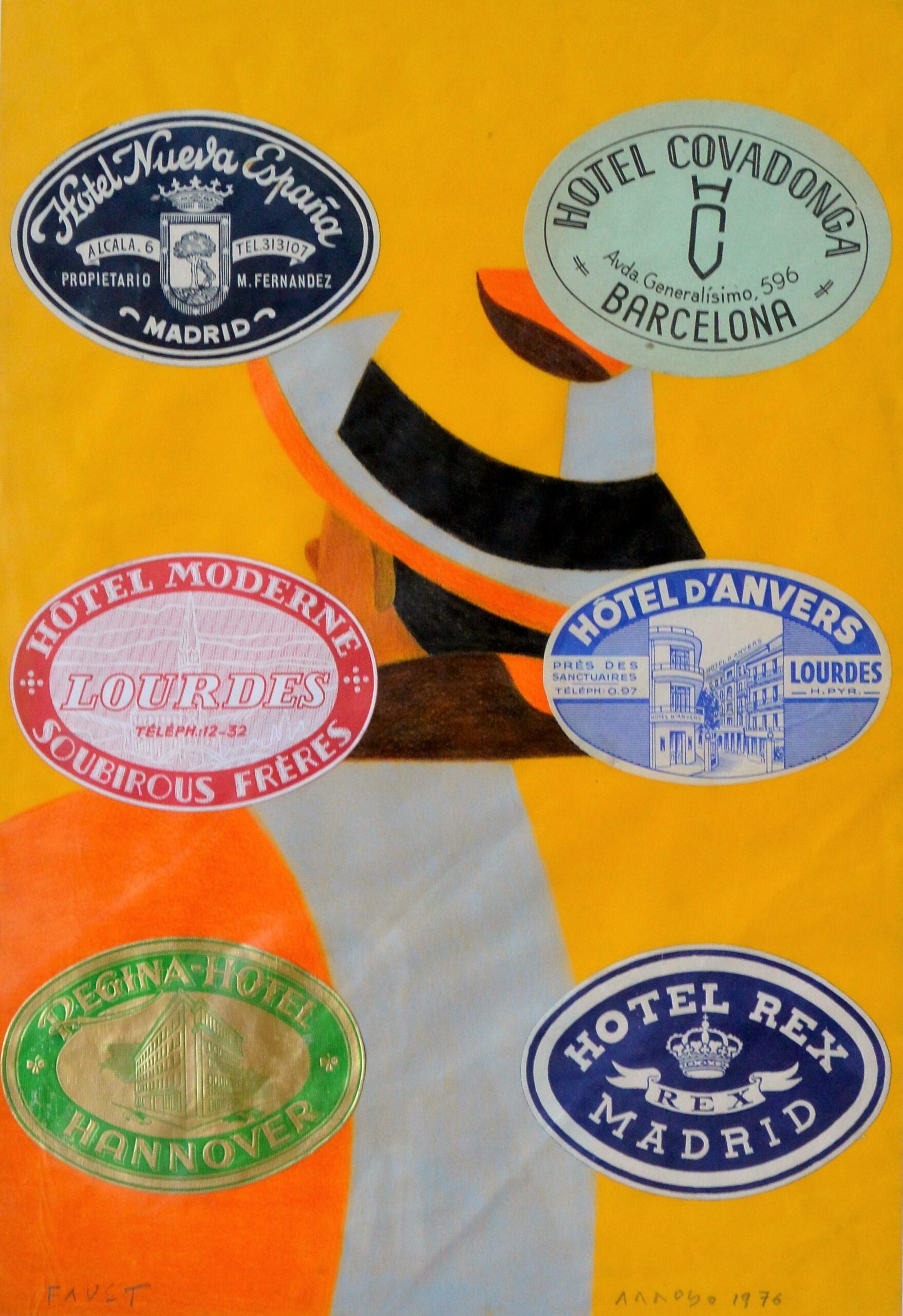 Arroyo Eduardo 1976, Faust, pintura original técnica mixta y collage cartulina, enmarcado, obra 44×30 cms. y marco 56×46 cms.