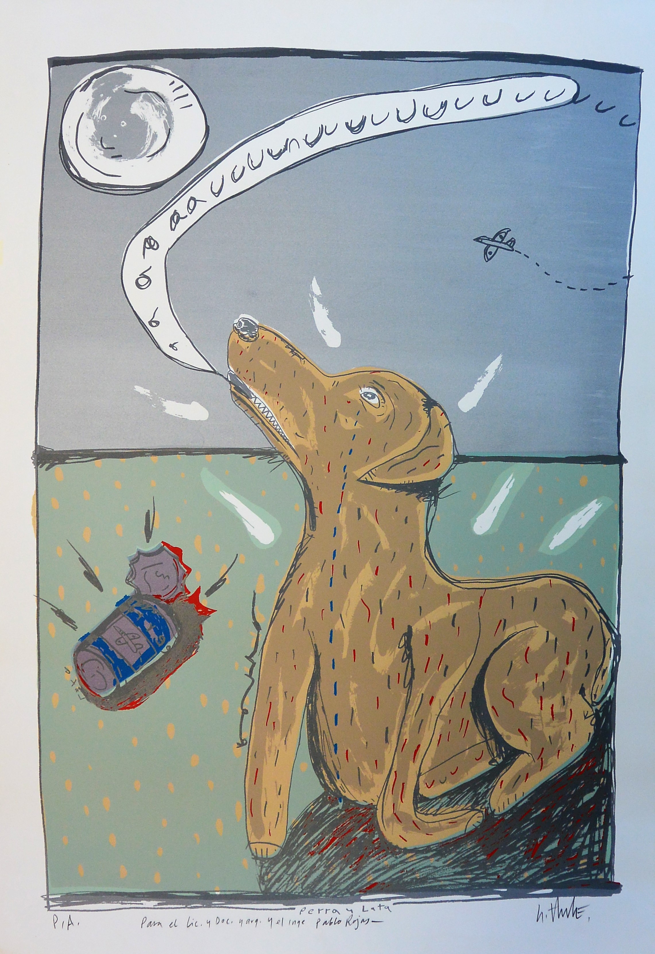 Arturo Iturbe, Perra y lata, serigrafía, numerado pa y firmado a lápiz, 106×75 cms. dedicado al impresor Pablo Rojas