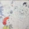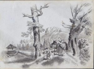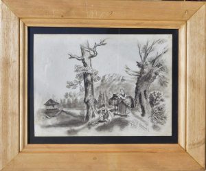 Asunción R., Campesinas en paisaje, dibujo lápiz carboncillo papel, enmarcado, dibujo 22×30 cms. y marco 37×44 cms.