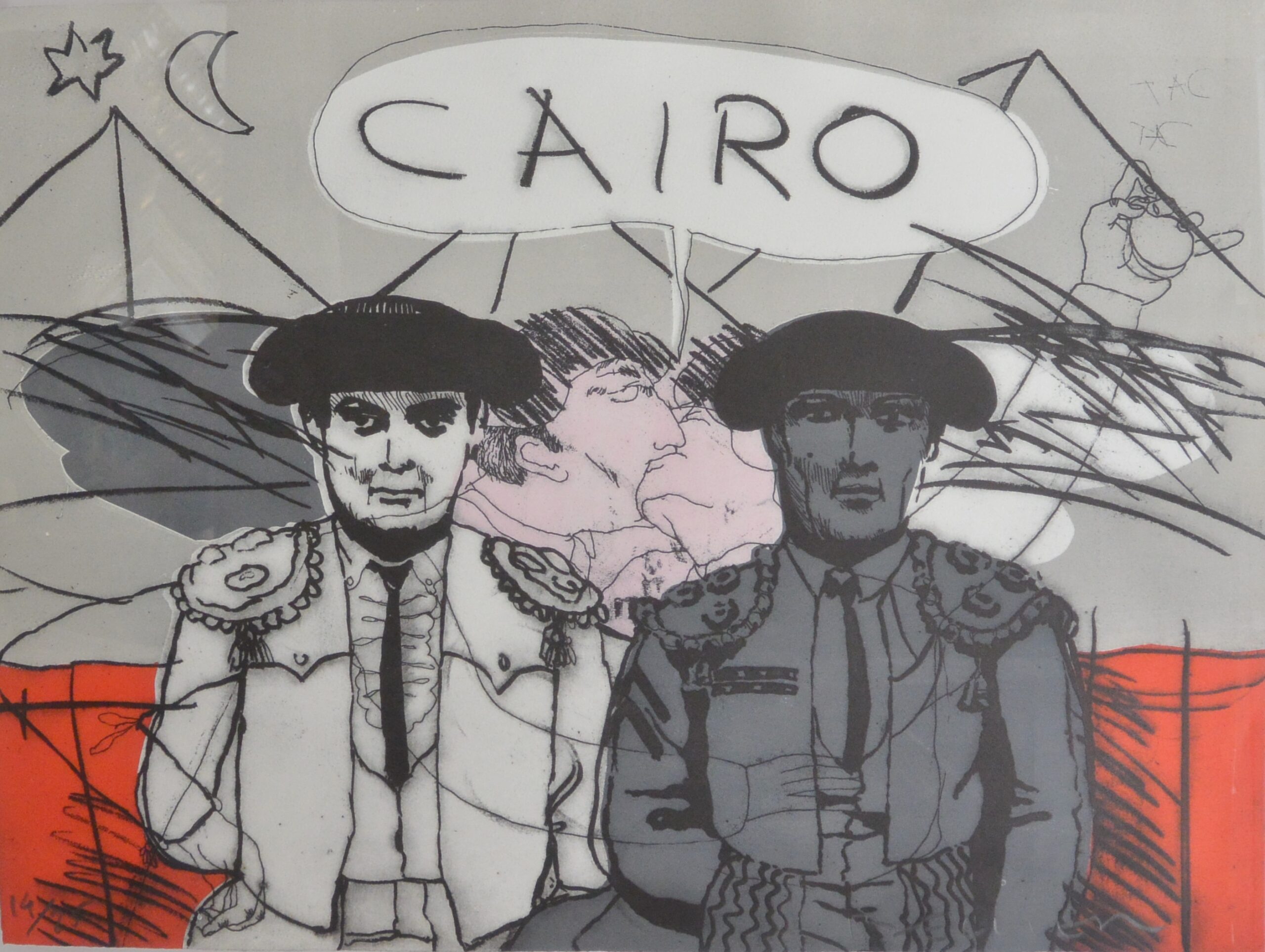Fernando Bellver 1982, Toros desde El Cairo I, grabado al azucar iluminado a mano, edición 25 ejemplares, numerado y firmado a lápiz, enmarcado, papel 49×64 cms. y marco 60×77 cms.