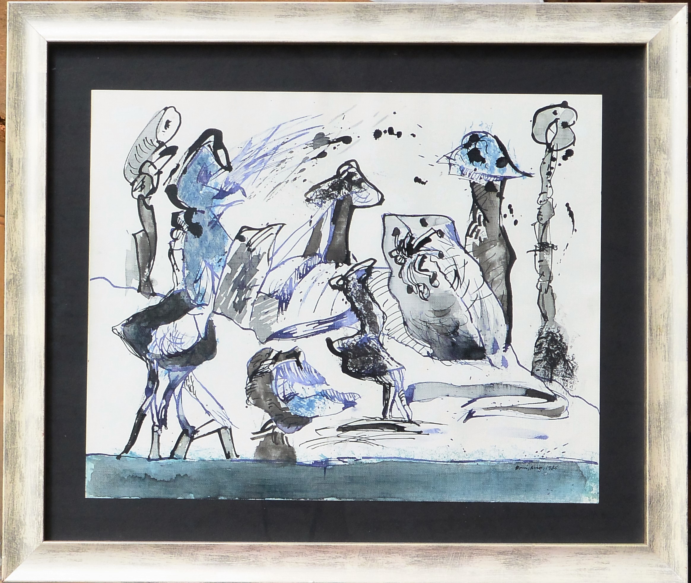 Bonifacio 1986, Emergentes junto al lago, acrílico y tinta cartulina, enmarcado, obra 40,50×50 cms. y marco 57,50×67,50 cms. Marco incluido
