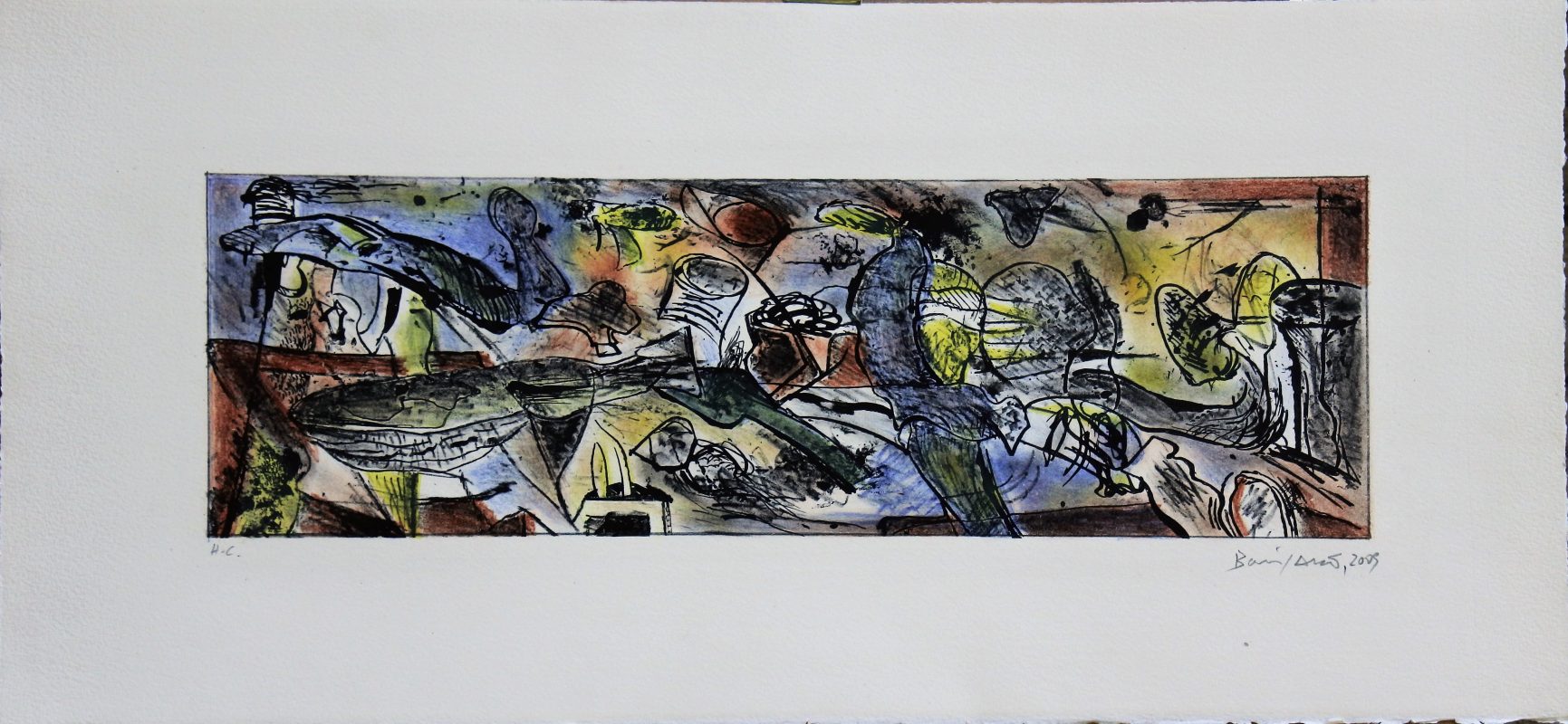 Bonifacio, Batalla en el horizonte, litografía color, edición 50 ejemplares numerado h.c. datado 2005 y firmado a lápiz, huella 13×42 y papel 27×56 cms.
