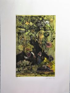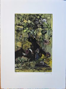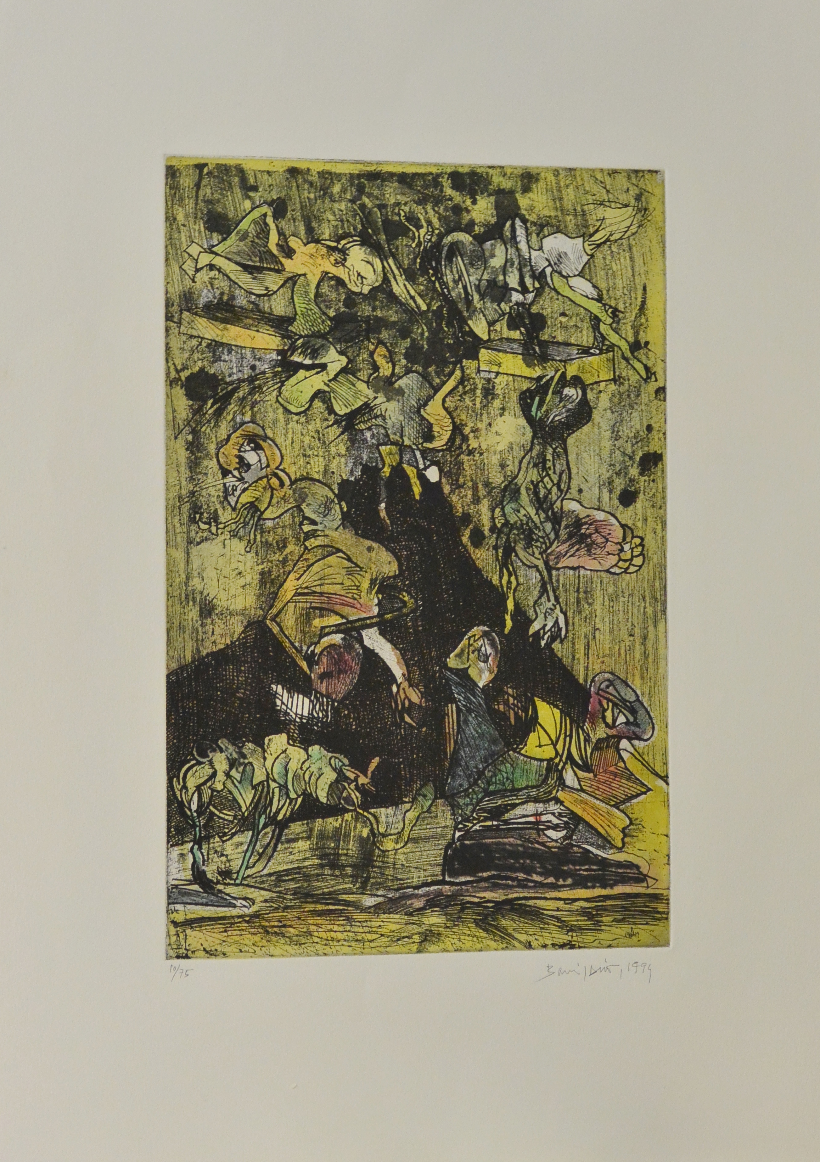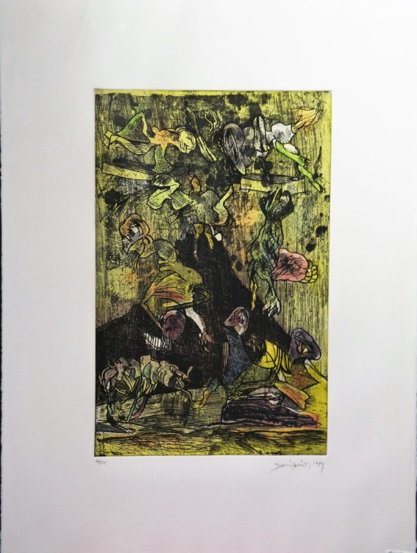 Bonifacio, Juegos frente al volcán, grabado aguafuerte, edición 75 ejemplares, numerado y firmado a lápiz, huella 50×42 y papel 76×56 cms.