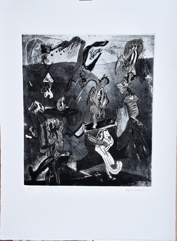 Bonifacio, Pienso que cada noche, cada día, cada hoy…, grabado aguafuerte, edición 75 ejem, numerado, datado 78 y firmado a lápiz, plancha 34×29 cms. y papel 54×40 cms. Se acompaña de carpeta con soneto de José Bergamín