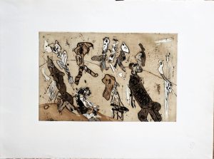 Bonifacio, Por la cuerda floja, grabado aguafuerte, edición 50 ejemplares, numerado a.p., datado 91 y firmado a lápiz, plancha 32×49 cms. y papel 57×76 cms.