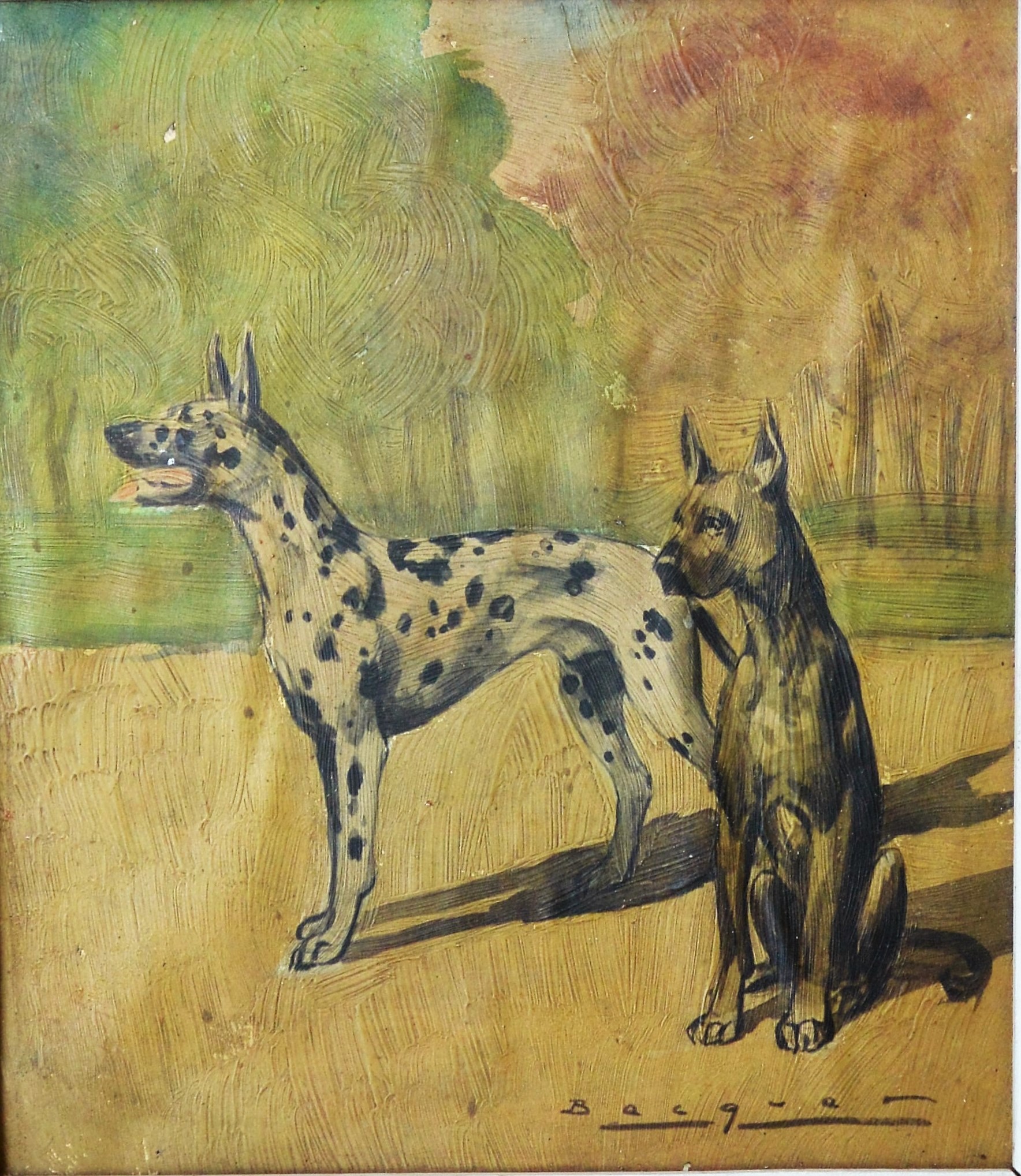 Carlos Becquer, Dos perros, pintura oleo carton, enmarcado, pintura 27×24 cms. y marco 36×32,50 cms.