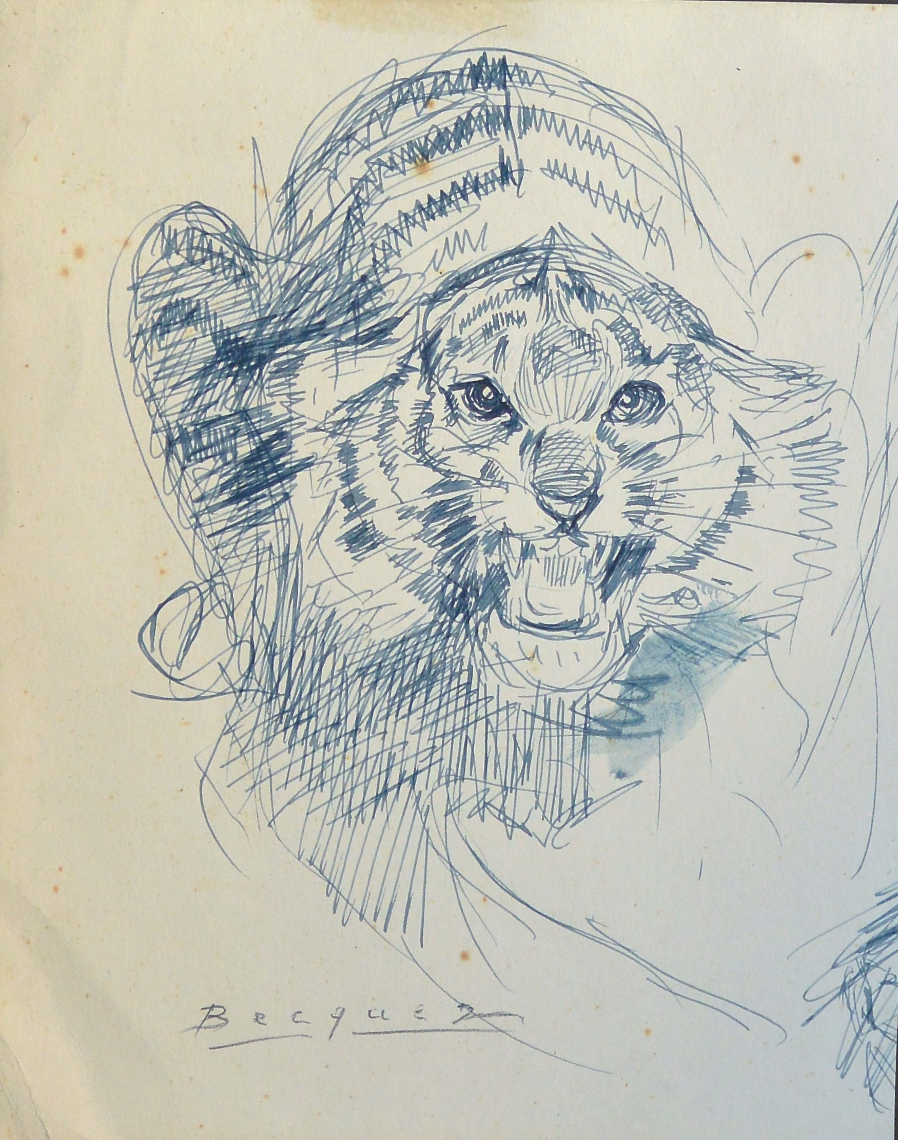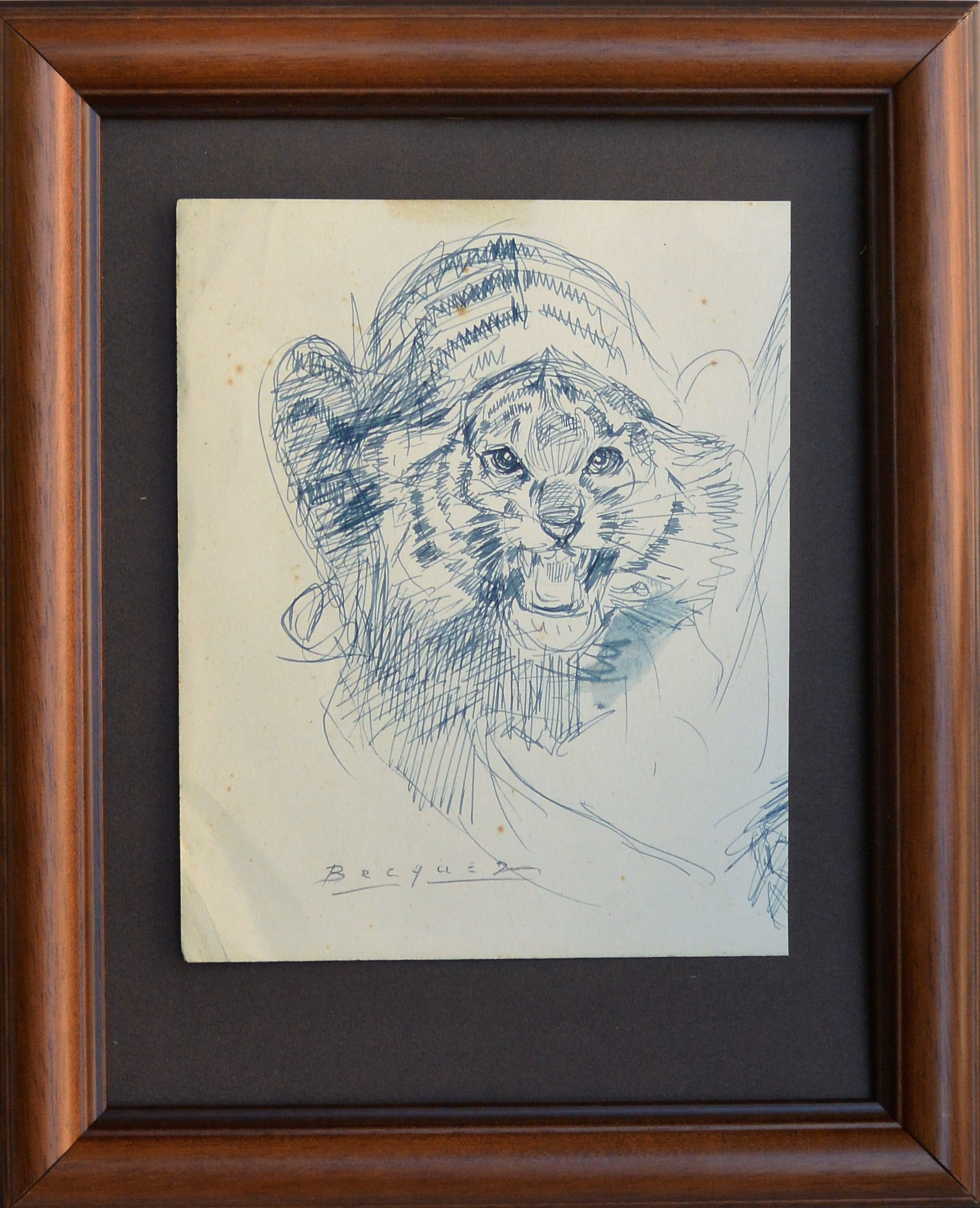 Carlos Becquer, Felino furioso, dibujo tinta plumilla papel, enmarcado, dibujo 20×16 cms. y marco 32×26 cms.