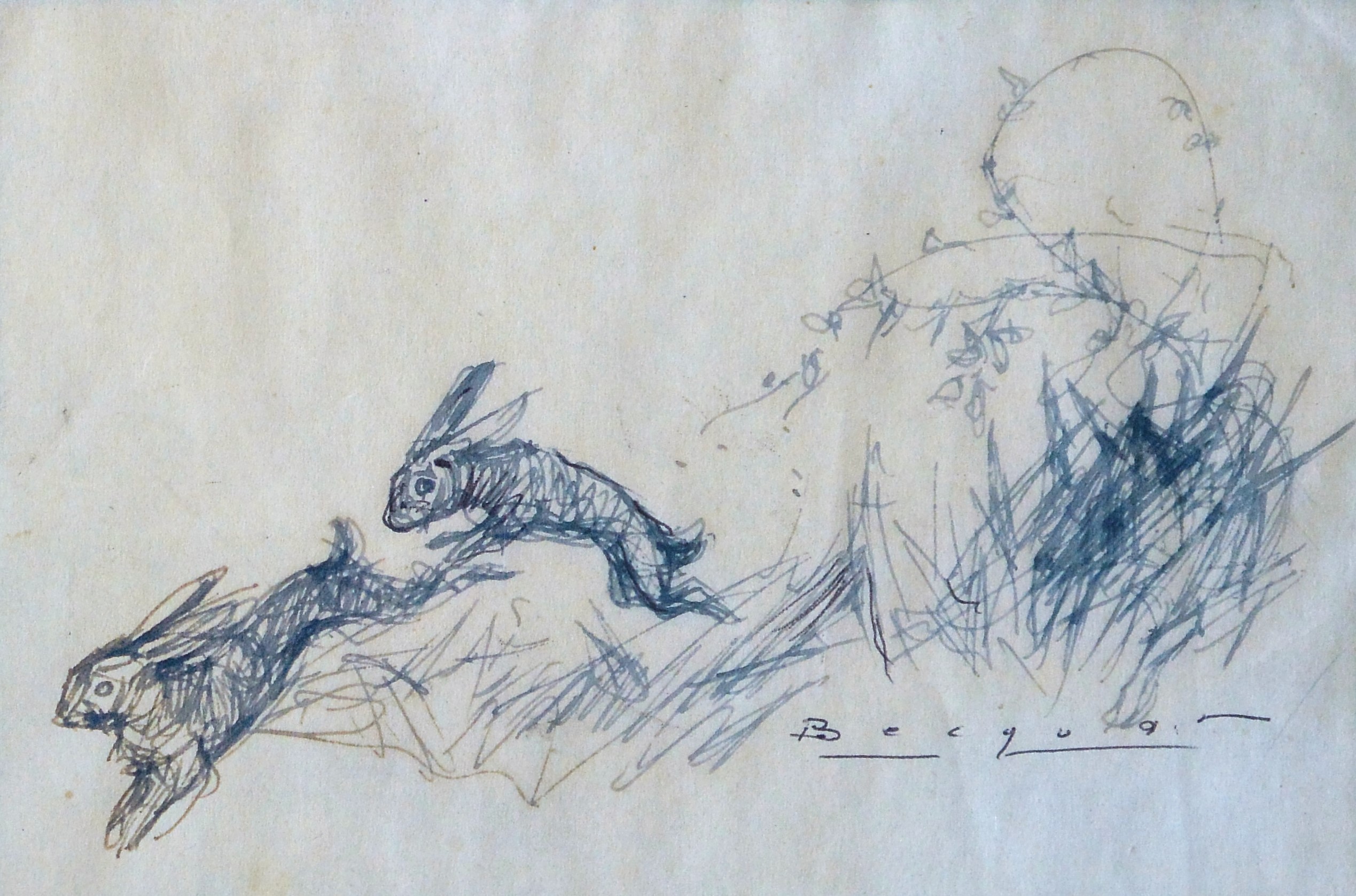 Carlos Becquer, Liebres, dibujo tinta papel, enmarcado, dibujo 10×15 cms. y marco 20×25 cms. Marco incluido