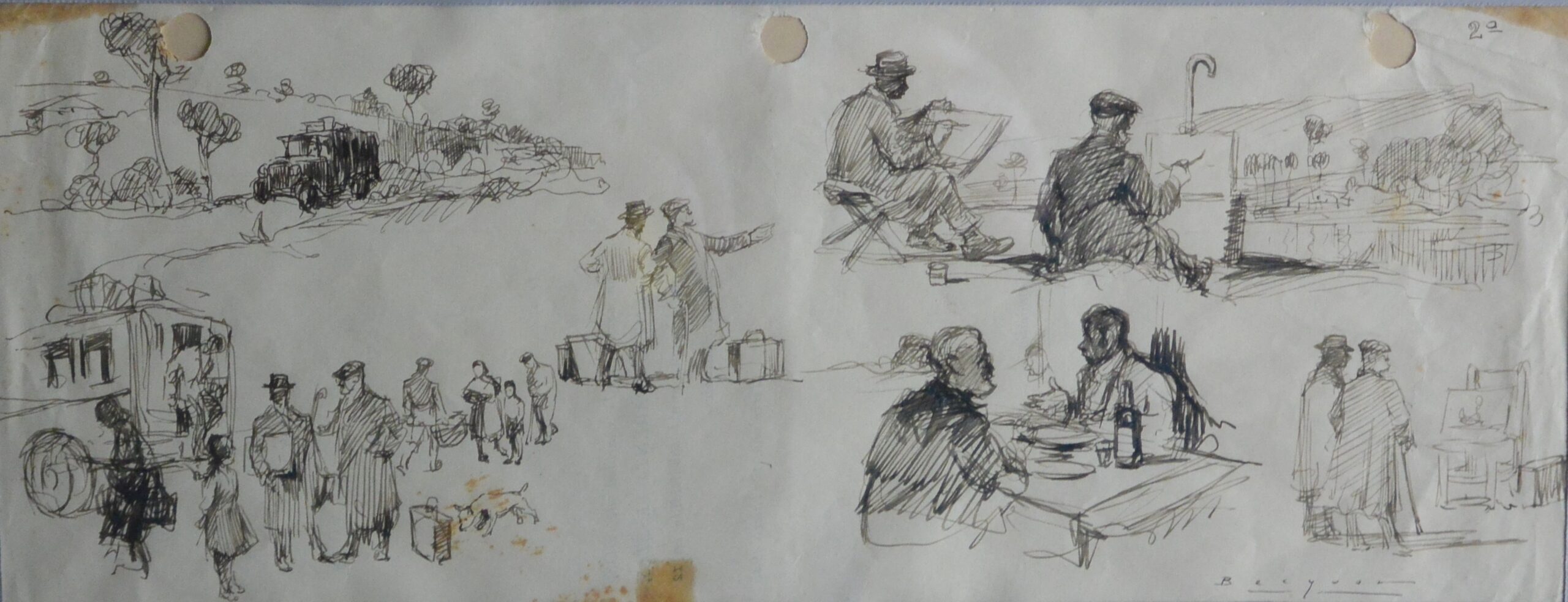 Carlos Becquer, Salida al campo II, dibujos tinta papel, enmarcado, dibujo 14,50×37 cms. y marco 33×55 cms. Marco incluido